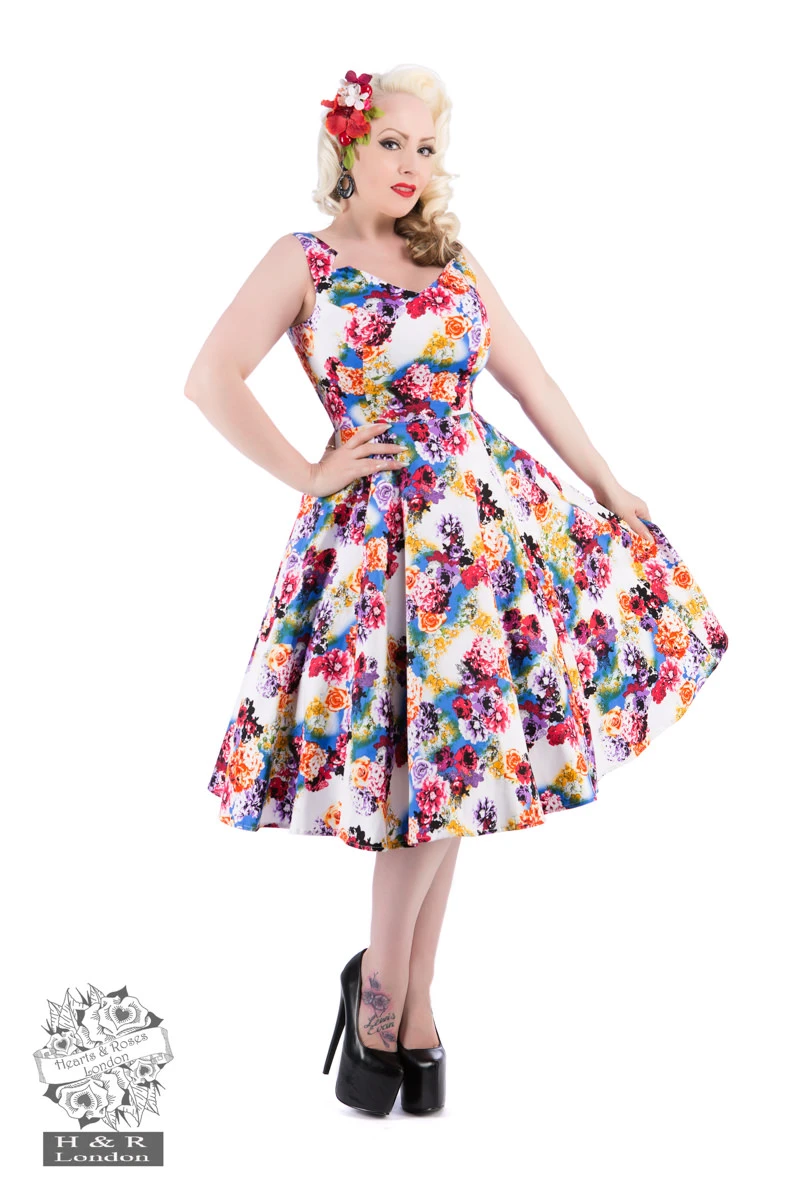 The clouds will part and the sun will shine right on you while you wear 50s Georgina Floral Swing Dress from H&R London! Â Bearing a striking pink, orange and red flower print set on sunny skies, this beautiful and unique dress fits beautifully on every figure. Â Â Dress is sleeveless, with a V-neck and 2 decorative side notches on the shoulder straps. Â Dress fully covers the back and hits just below the knee. Â Reinforced zipper for easy on, easy off. Â Add a Hearts & Roses white petticoat for even more whimsy!