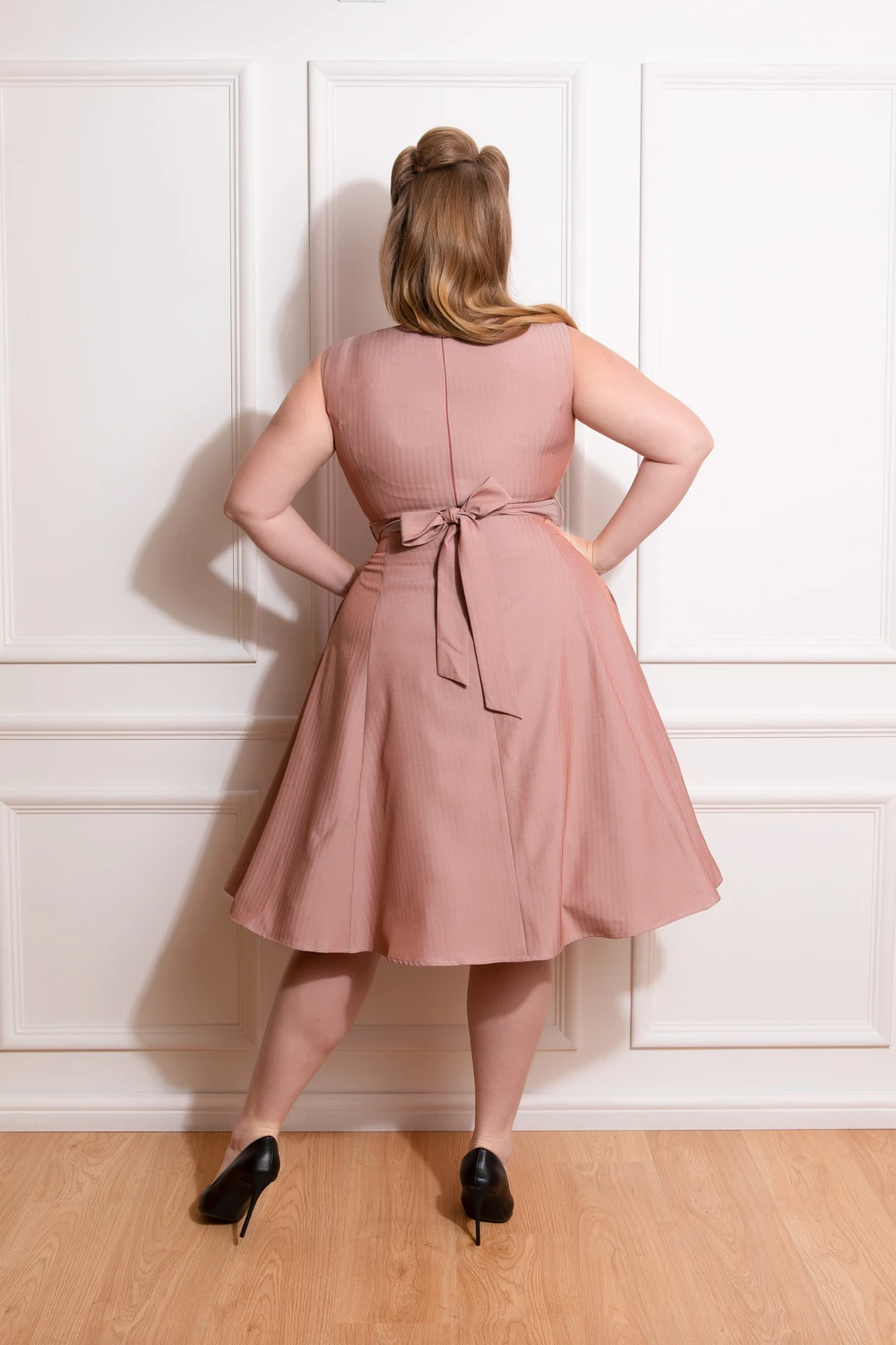 Step into summer in style with our Alison Swing Dress! This brand new summer style is perfect for your next big event! The fabric is chic and sophisticated in its look and feel, detailing a beautiful chevron weave. The subtle pink tone of the dress catches the light beautifully, making it a stellar summer piece. Featuring a v neckline, leading to delicate front buttons, this dress is great for a summer soiree. The tie belt adds that feminine touch as it cinches in the waist and finishes in a beautiful bow, which can be placed either at the front or back of the dress. We also incorporated the very practical hidden side pockets for your ease!