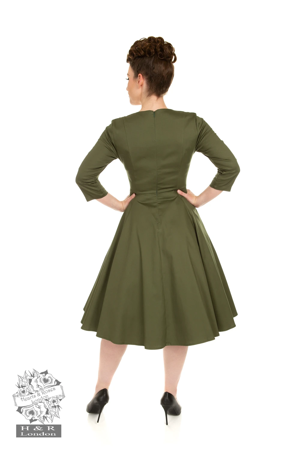 Our Angelina Khaki Green Swing Dress is a new casual style in our AW21 collection. The strong khaki green colour works beautifully as a casual day to day dress during the autumn winter season. The simple V neckline is flattering for all and the fitted waist is accentuated with the delicate button tab design detail. We have added our signature hidden pockets for your ease and the ¾ length sleeves make this a great transitional piece. Add your favourite accessories to add your own spin, although this piece definitely can stand alone.