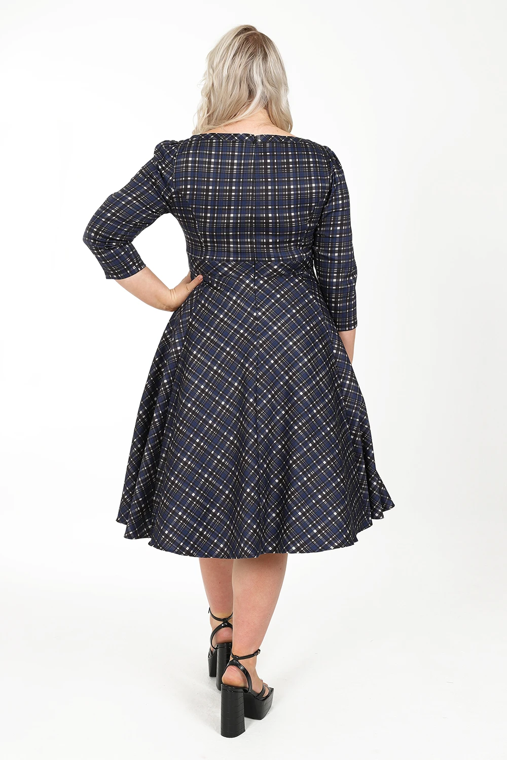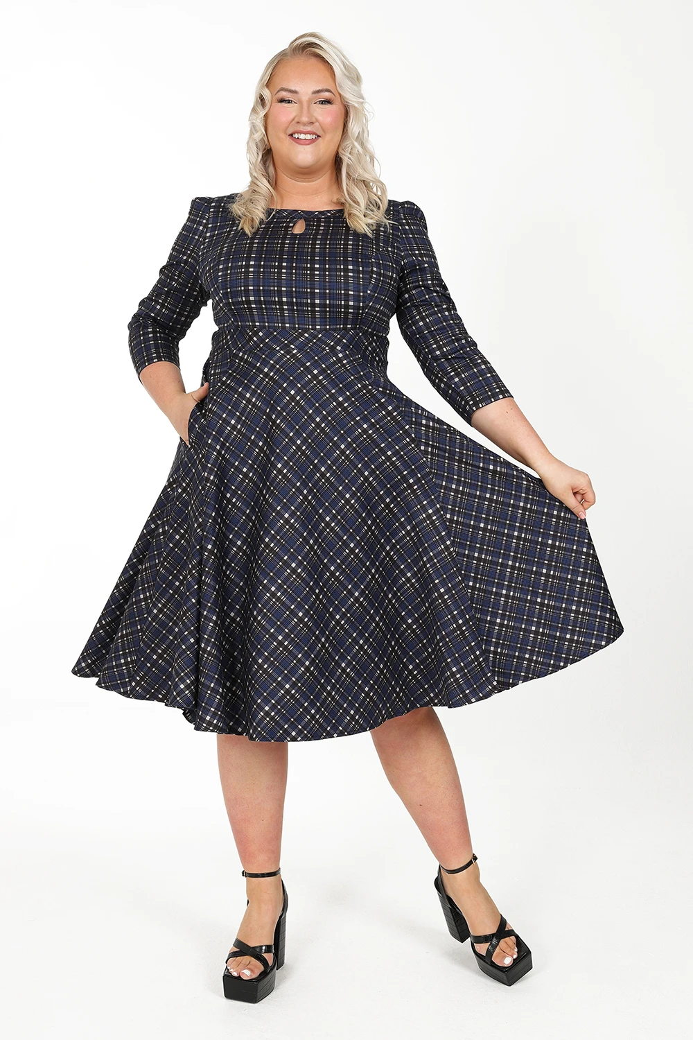 Our brand new Anna Check Swing Dress is a perfect addition to any winter wardrobe. The gorgeous check print adds layers of subtle colours to your outfit, while the classic shape perfectly balances the overall look. This style sports a boat neckline which sits neatly on a fitted bodice to create a lovely shape which flows down into a swing skirt, reminiscent of the 1950s. The ¾ length sleeves work well with the flowing skirt, which also has hidden pockets for extra ease! This style is easy to wear with flats or heels, making it the perfect go to outfit this autumn/winter.