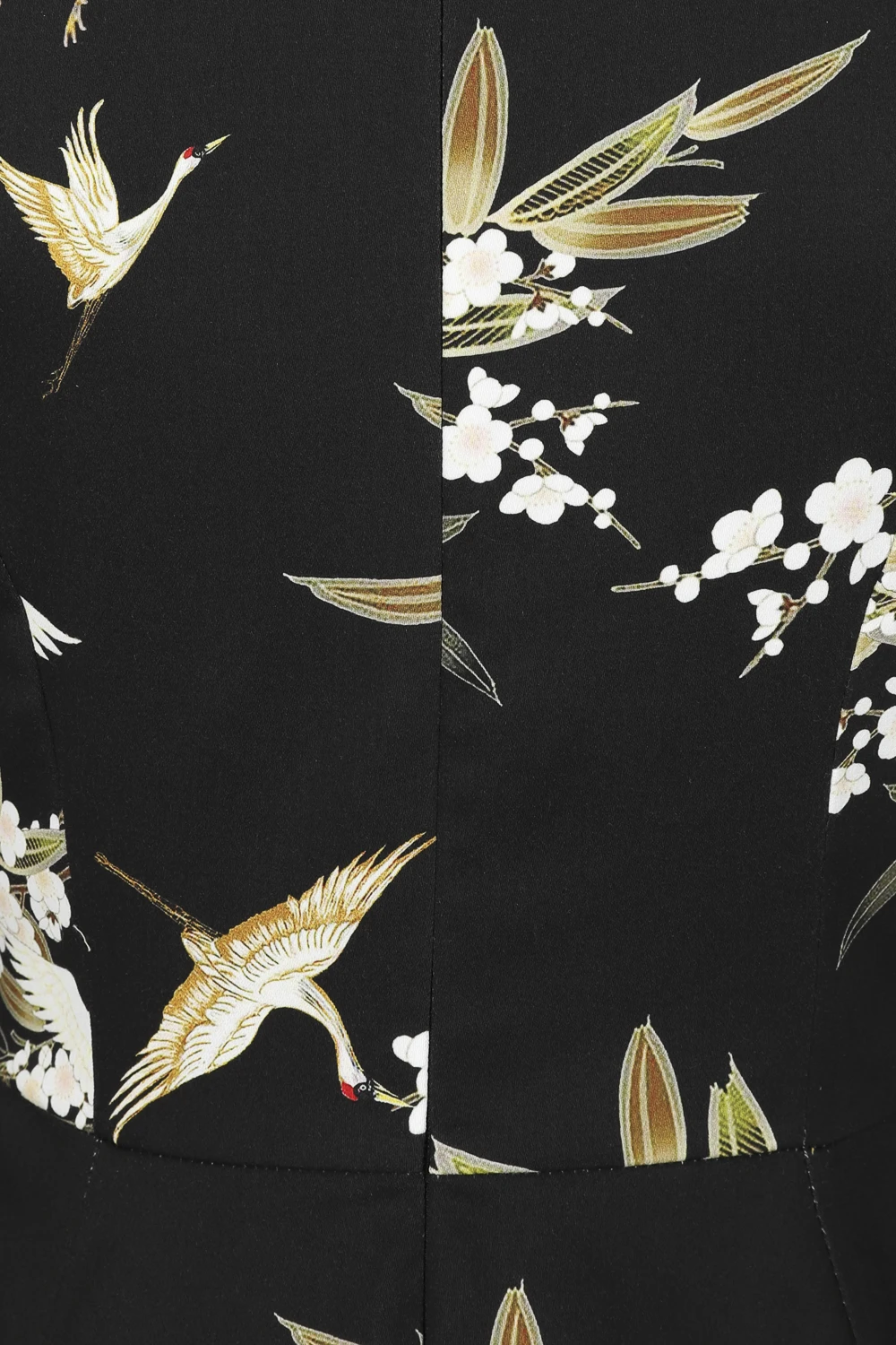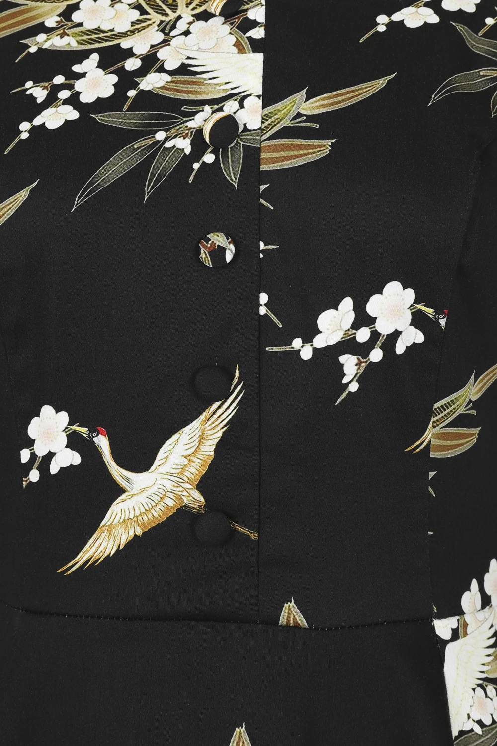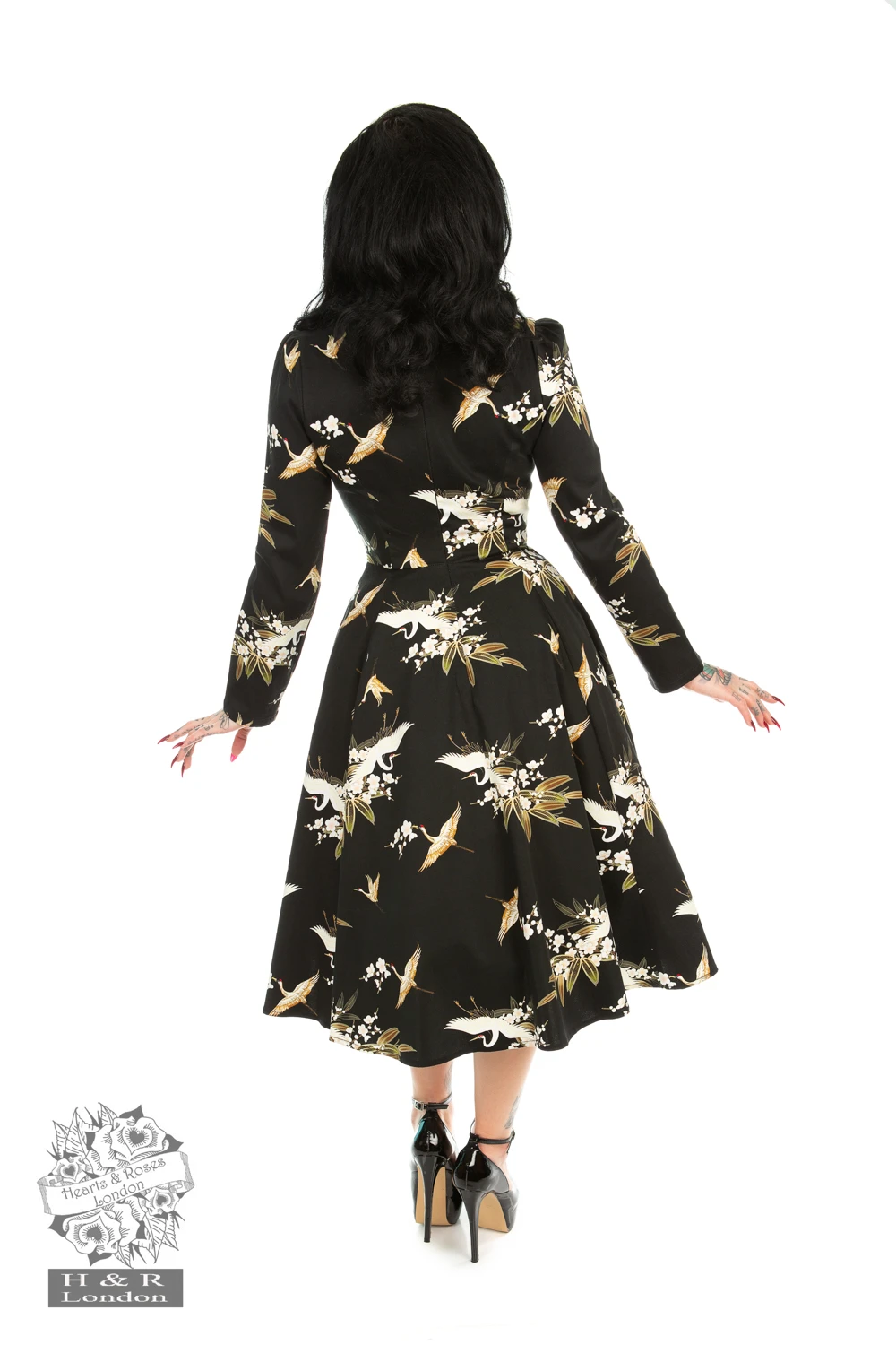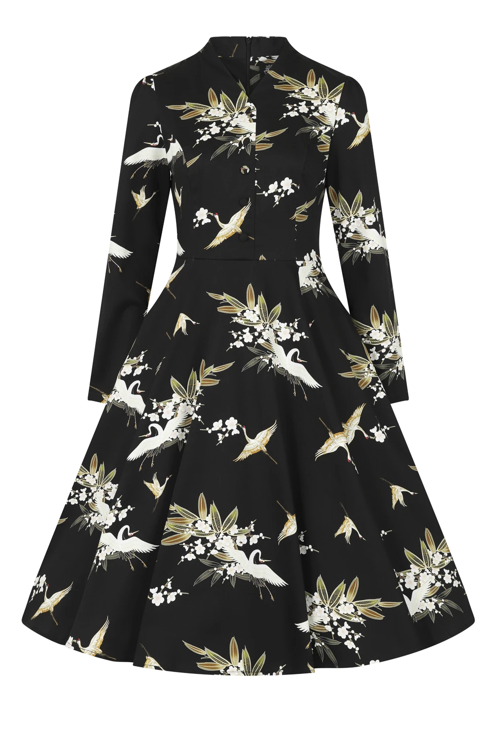 Find your perfect 50s styled swing dress with our latest addition. This beauty flaunts a fitted bodice with a stand collar and a V neckline. With a new season ahead of us we added full sleeves, to give you the perfect choice of wear in autumn or winter. She flatters from every angle, including the print of birds & florals, which are set on a black cotton blended fabric. The perfect Autumn/Winter style for any kind of occasion, so slip into our Birdie floral before the season is over.