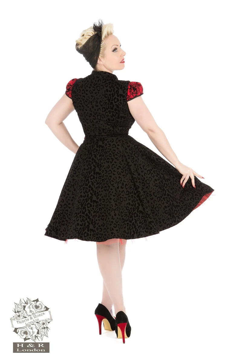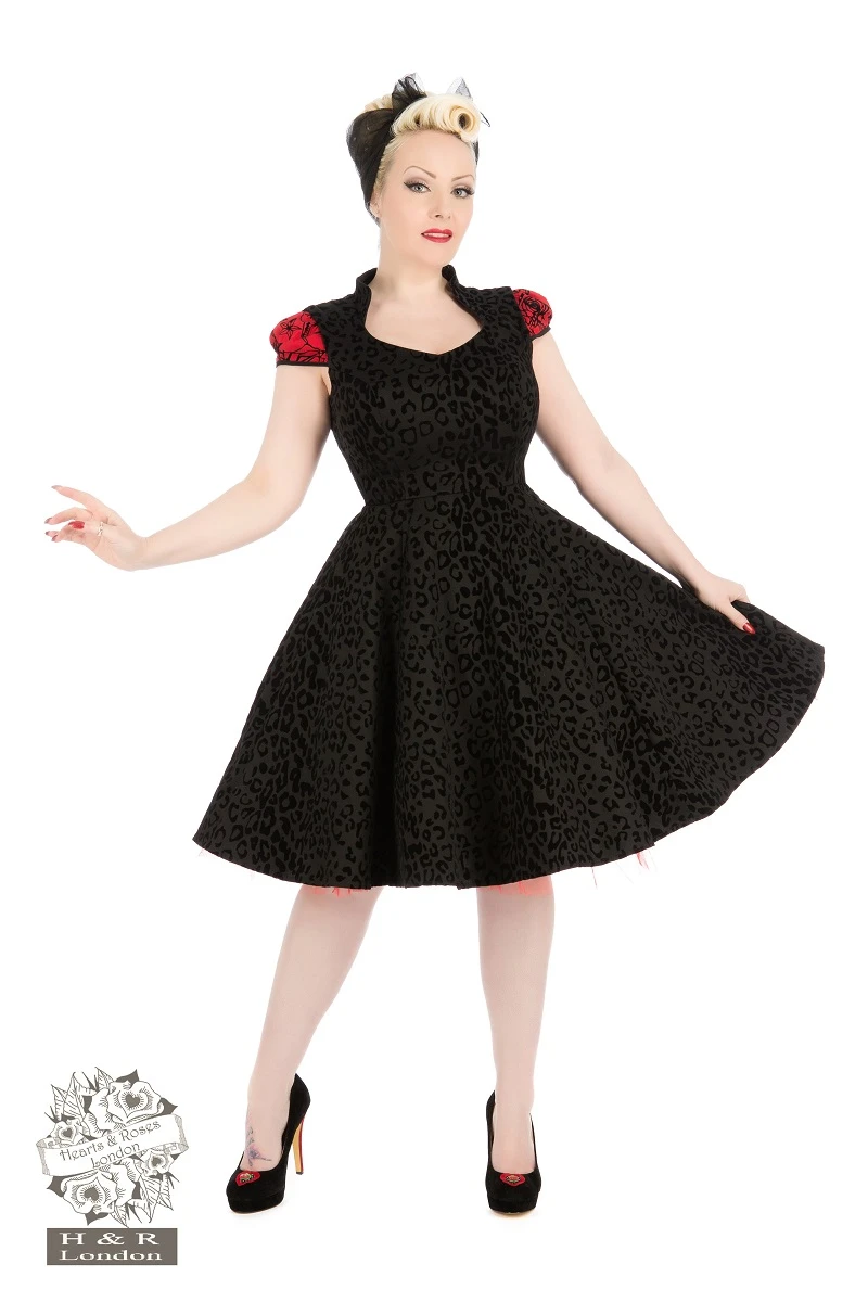 Behold, my pretties! 聽 聽The Black Leopard Flocked Felina Dress from H&R London is a retro-style dress. 聽 聽The cap sleeve are different colour and fabric from the main colour which help you to stand out of the crowd. This dress has a sweetheart neckline The Dress has a raised felt flocking design of stars, bows, anchors and swallows on sleeves, Leopard flock all over this dress making it beautifully textured. The dress has a full swing skirt that flares out at the waist.