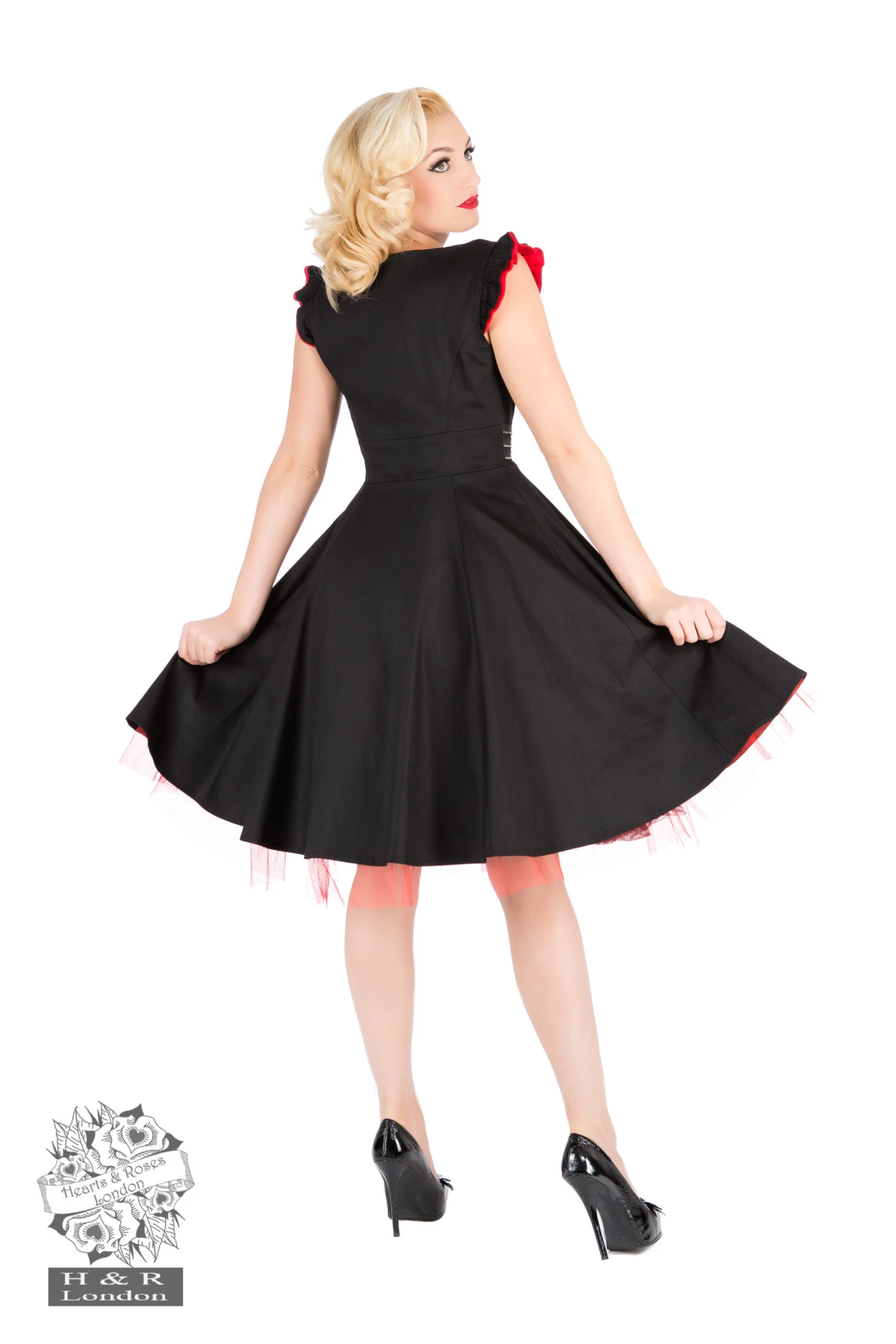 Zip up to Sexy! H&R London’s Zipper Dress is a black pinup style dress made out of a soft, stretchy cotton blend. Dress has flutter sleeves lined with red details with a sensual sweetheart neckline. Dress has three rows of zipper details at the waistline in front. Dress has an A-line skirt and a red cotton-lined built in petticoat to give that little extra bit of pop to your pinup! Dress zips up the side, and hits at the knee.
