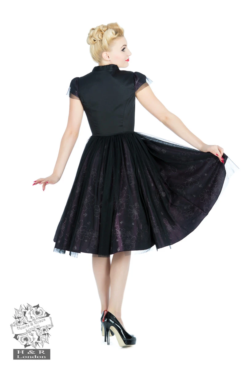 The Black Purple Satin Evening Prom Dress is what sweet dreams are made of! This beautiful evening dress is made out of a beautiful purple satin underskirt, with a lovely sparkle studded floral pattern set on the purple satin. Lush black organza covers the skirt and decorates the cap sleeves. The Organza Dress features a Queen Anne neckline with flattering bust darting on the bodice and a fitted waist.