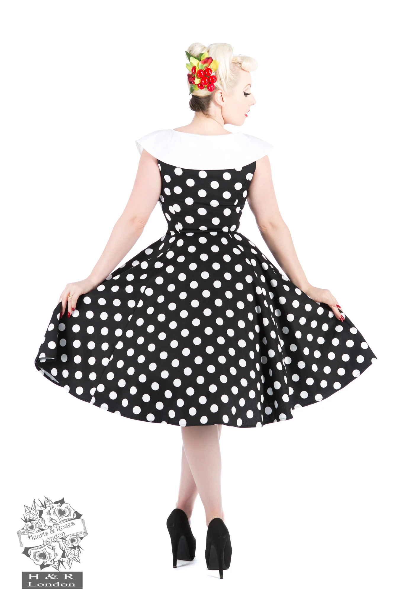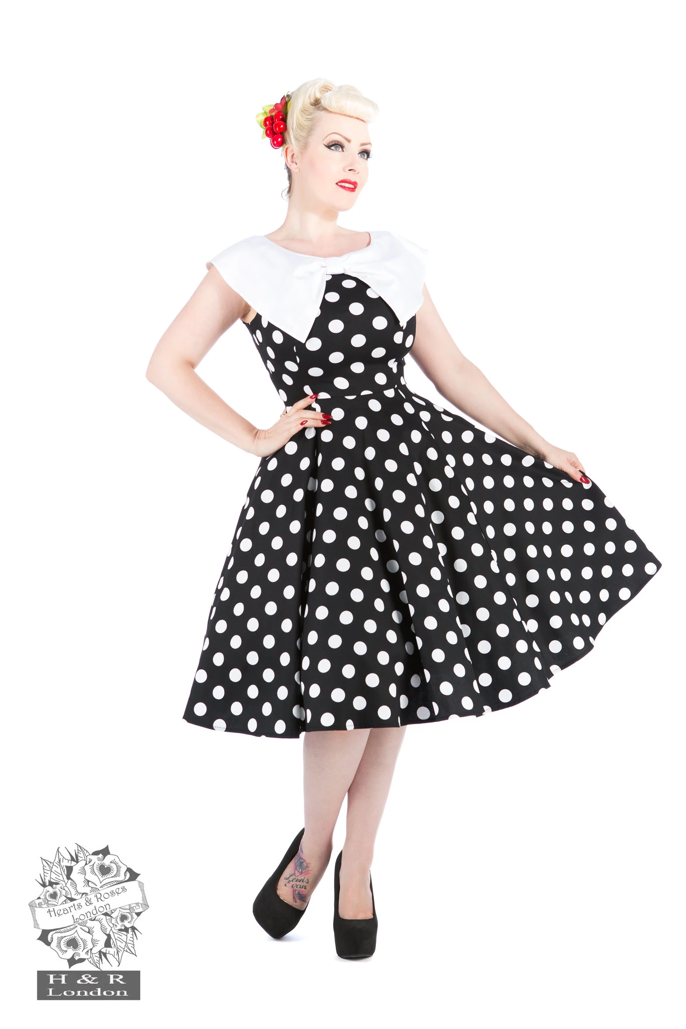 You will look cute in H&R鈥檚 Black White Polka Dot Swing Dress! It is a classic black and white polka dot swing drees with a pilgrim collar that help this dress stand up and out. A wide white modified pilgrim collar creates a beautiful bow top on the dress. Classic polka dots makes it a retro restock, as you will always need more! Collar extends down the back of the dress just to the dress just to the shoulders.