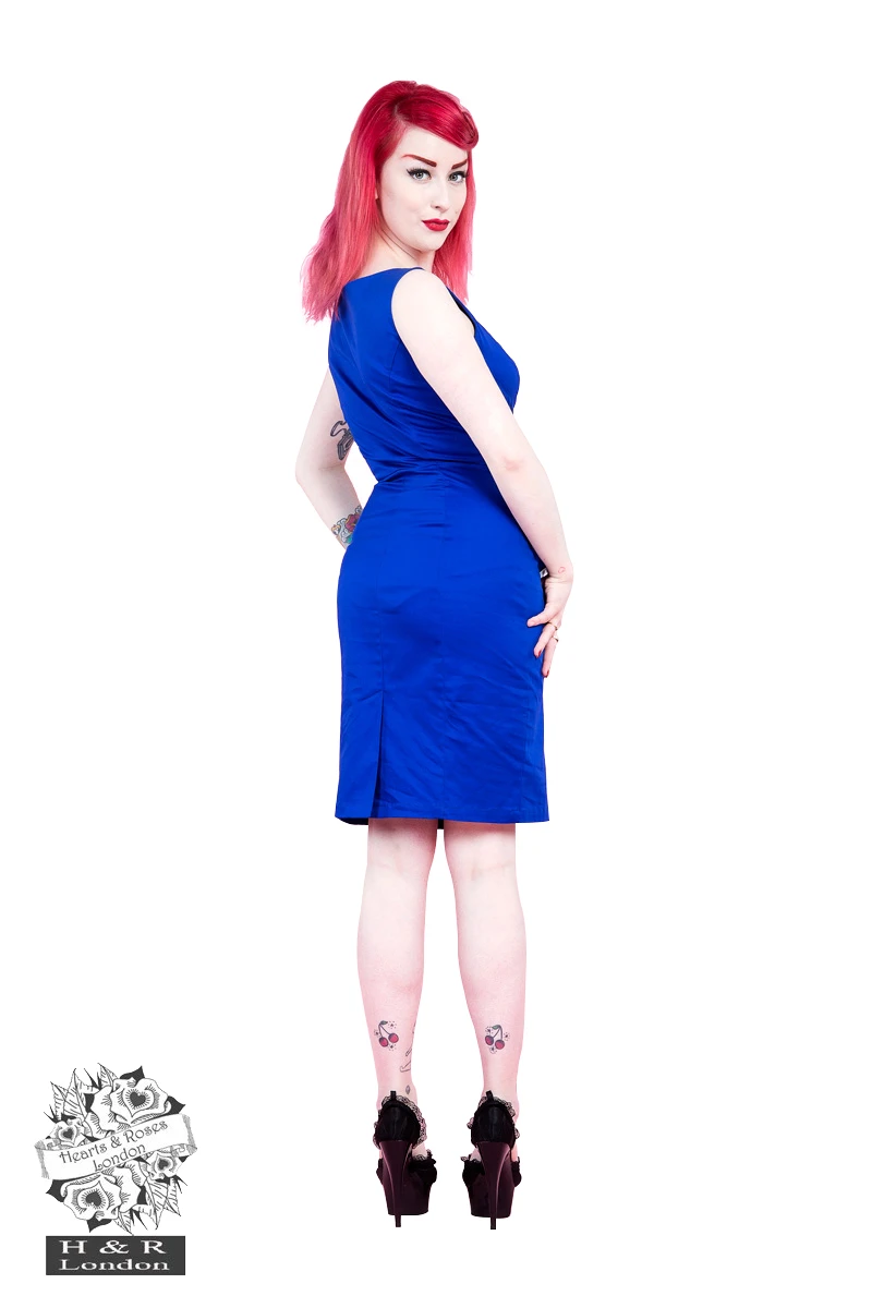 Did someone say they love pin-up? Oh yesss, we present our latest addition in a rockabilly pin-up style. This style will have you making a statement at any type of special occasion. Our pencil dress is made from a subtle, but yet elegant blue fabric, with white trimmings and a fitted bodice. As you will notice, we designed a signature halter neck style for a modern twist which flows down into a sweetheart neckline. A must have for those pin-up occasion!