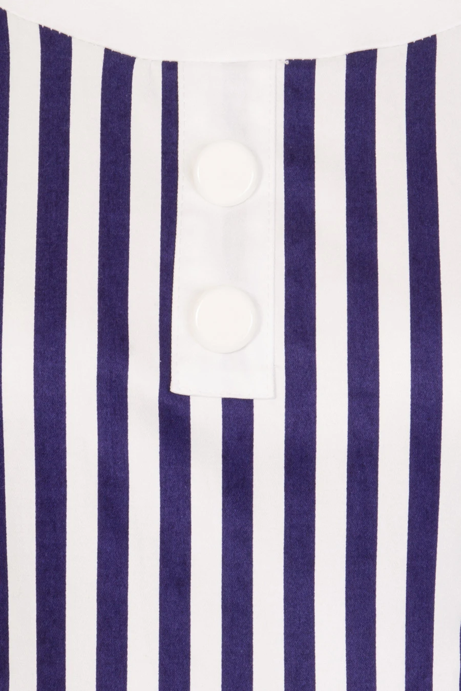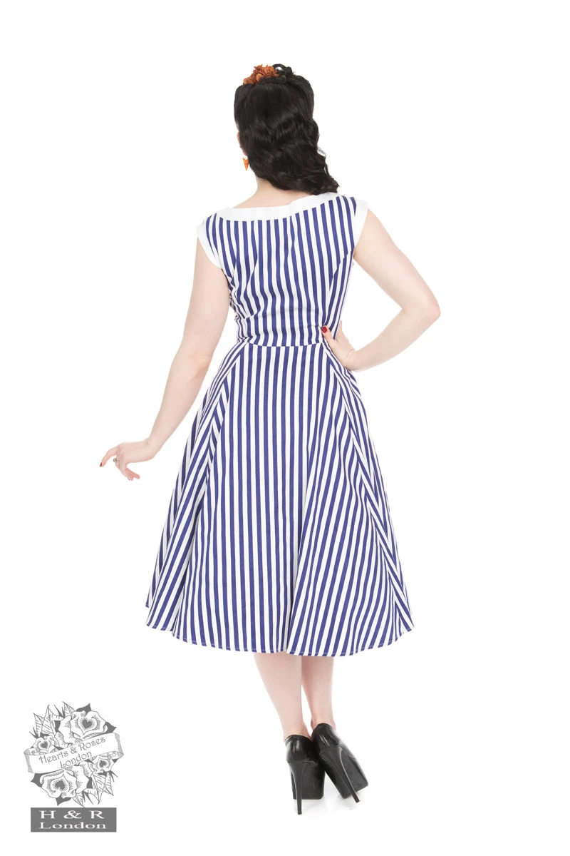 Strip off your summer wish list because our Blue Stripe Hepburn dress is the one for you. Summer couldn’t get any better with this classic striped design. If you haven’t found your perfect summer match, why not go for the striped theme. The neckline features a round neckline, with a 3 button detailing sitting just on the chest. The soft stretchy cotton fabric is a joy to wear. You just can’t miss out on this classic vintage piece.
