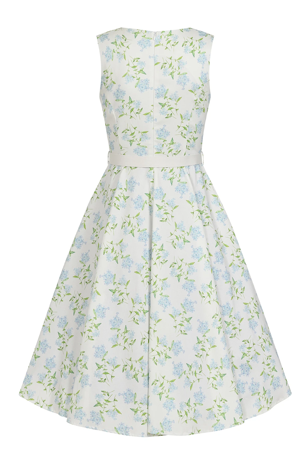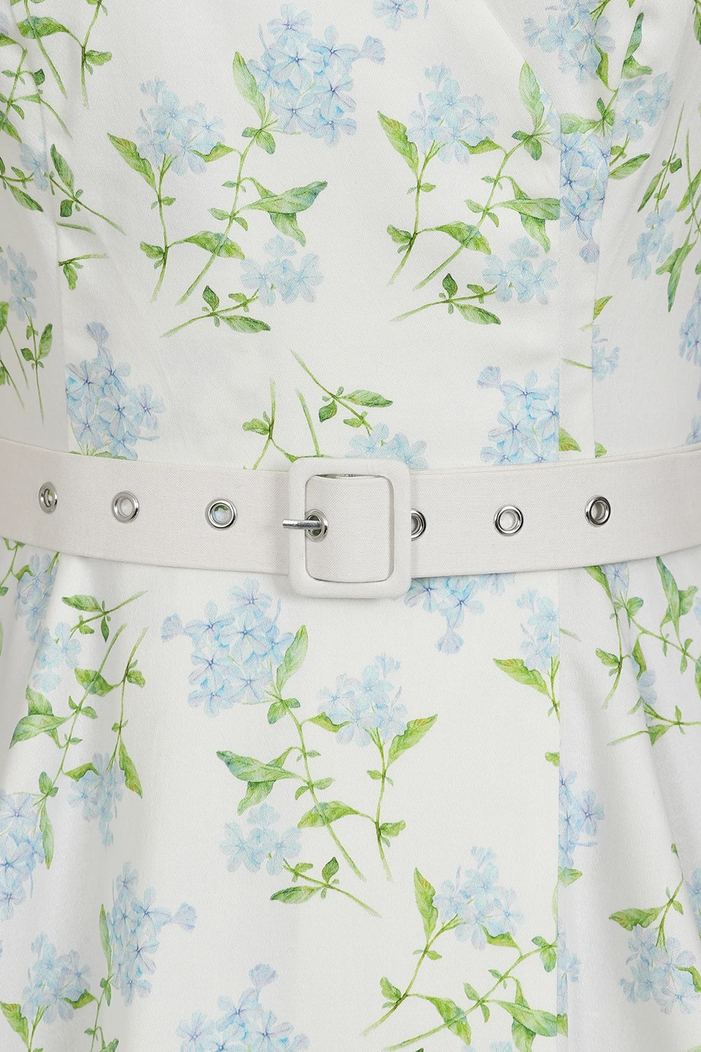 Introducing our newest piece to the collection, our Brandi Floral Swing Dress. Sweet with its front v neckline, leading into a decorative wrap front seam, this style pays close attention to the details. The delicate print emulates the fresh spring air, with its white base colour standing underneath a shower of soft blue petals and green leaves. The white belt sits on the waist to accentuate the full skirt shape which is not only fun to wear but also super comfortable! Included are pockets hidden neatly in the side seams to give an added level of practicality. Pair this style with simple or statement jewellery of your choice, making this piece perfect for a day or night event!