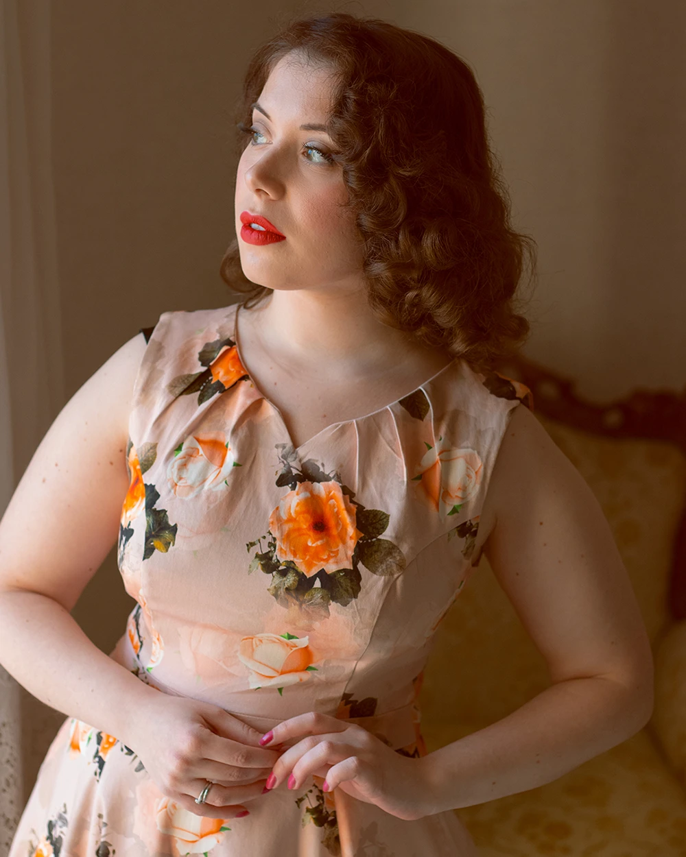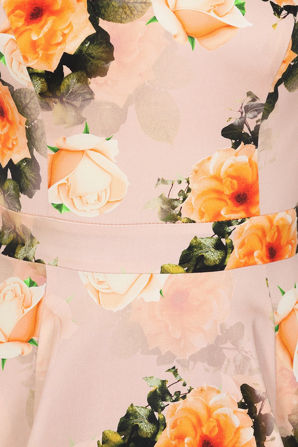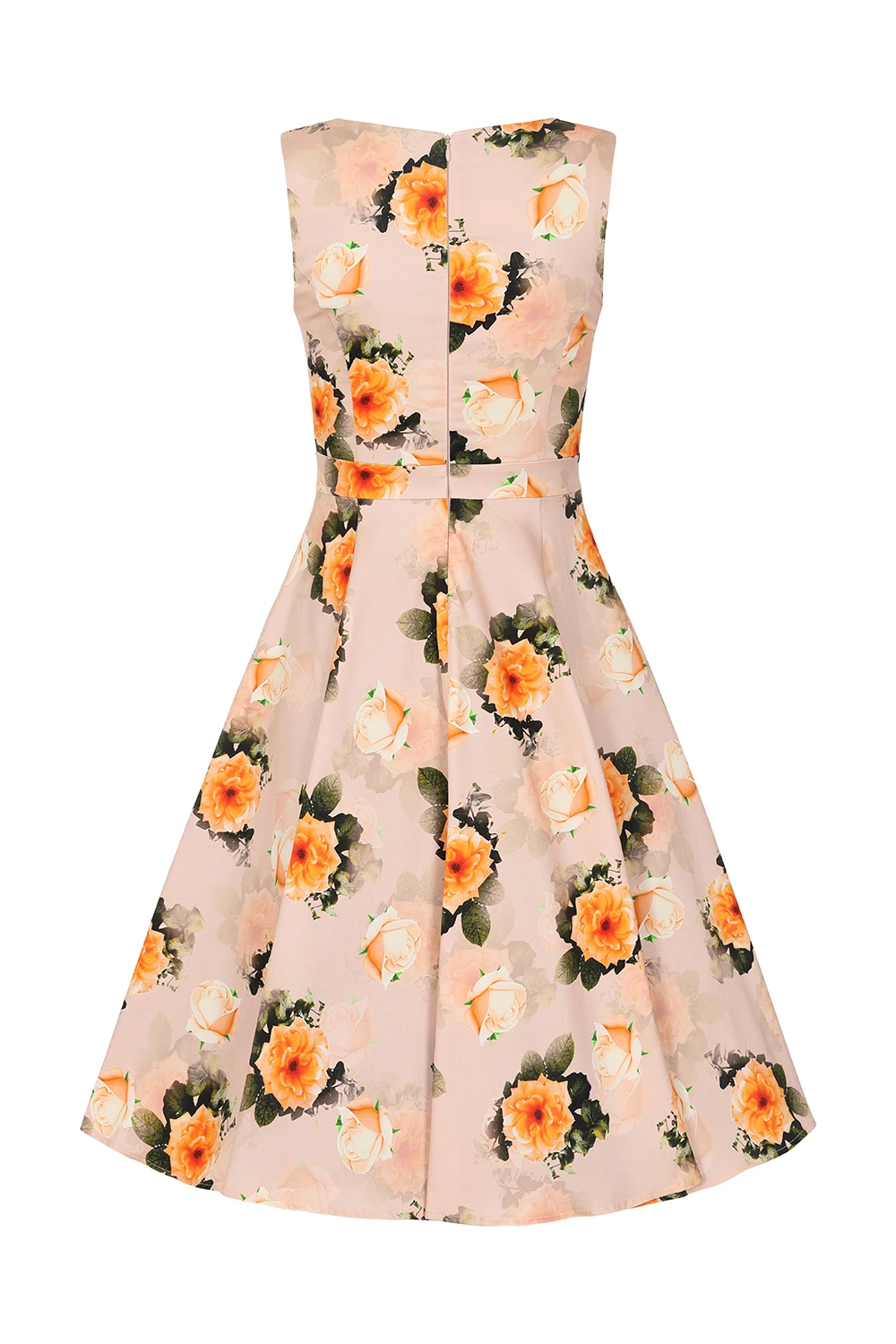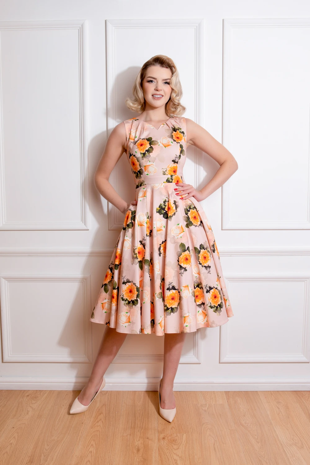 Our newest addition to the spring summer collection is our Casandra Floral Swing Dress. This new summer swing is sure to brighten up your day with its summery tones in the beautiful floral motif. The soft orange print base sits so well beneath the strong orange florals and dark green leaves, breathing life into this brand new style. The classic V neckline is incredibly elegant and sits neatly on the neckline with front pleats. The waistband cinches in the waist, accentuating the full flowing skirt, making this a 1950’s dream silhouette. Pair this style with flats or heels to complete the look.
