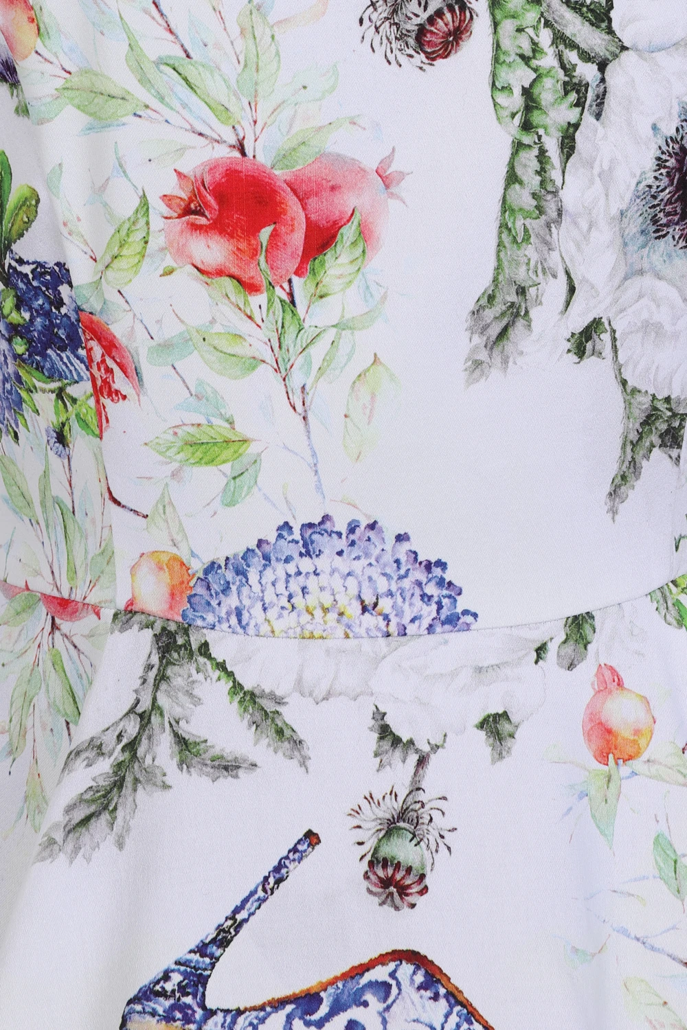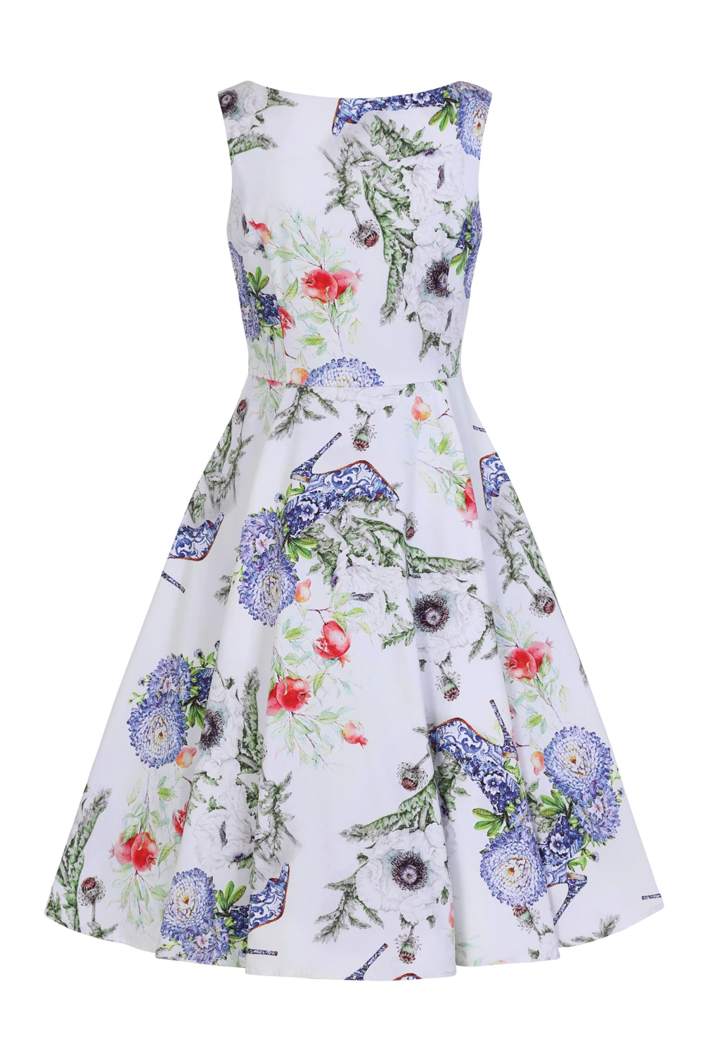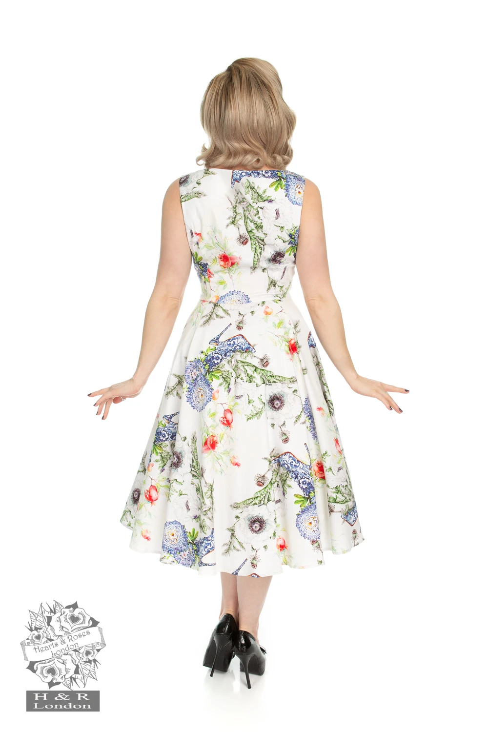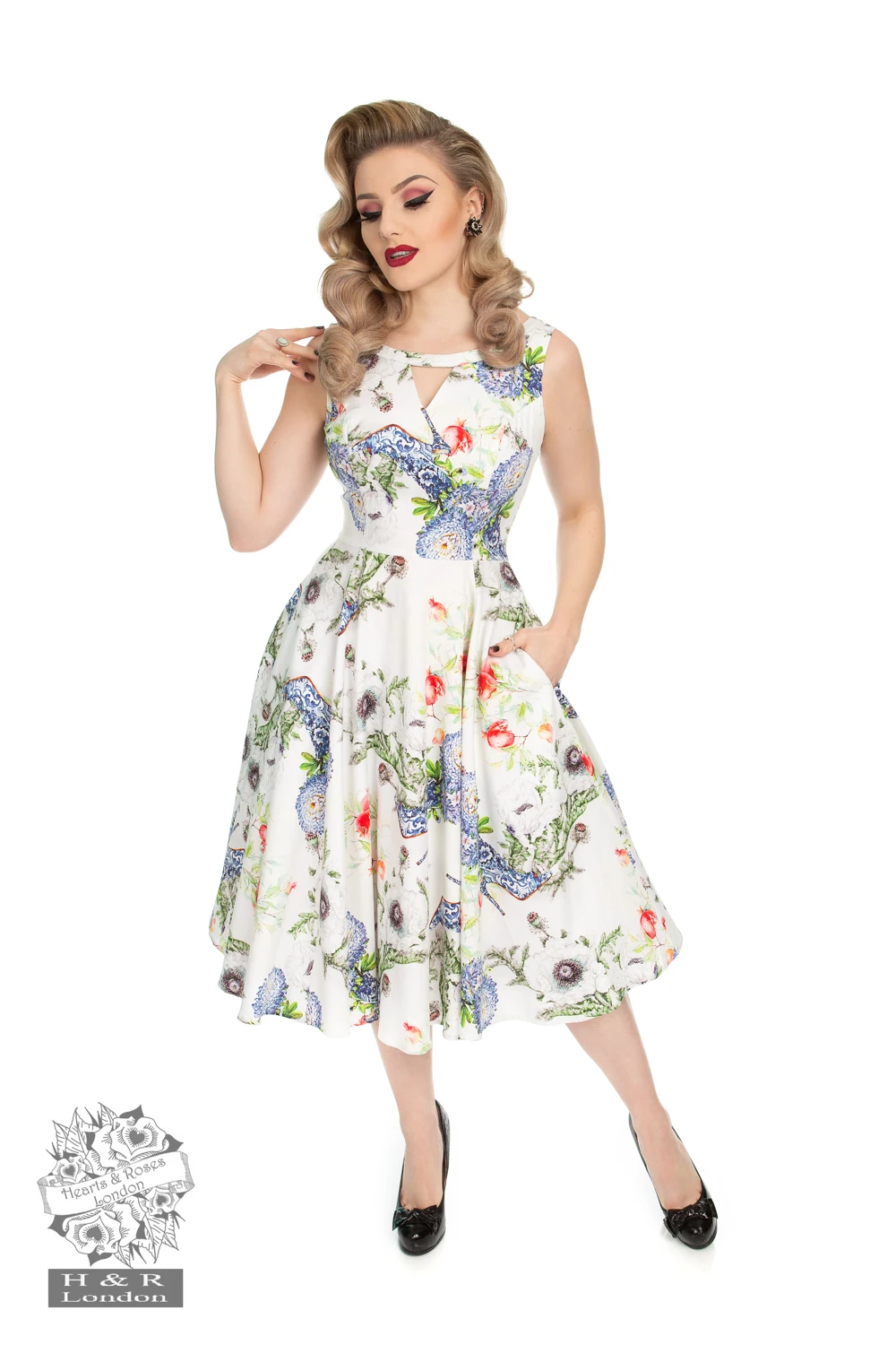 Oh, sweet Cinderella! Feel as beautiful as Cinderella this summer in our astonishing floral swing dress. If you look closely, you may find her missing shoe. The print features red rose buds on green leaves, with blue Dahlia flowers and blue stilettos. Detailed with a simple rounded neckline, we added a V-shaped cut out just under the neckline panel. Before the clock turns 12, and summer arrives, stock this beauty for the ball.