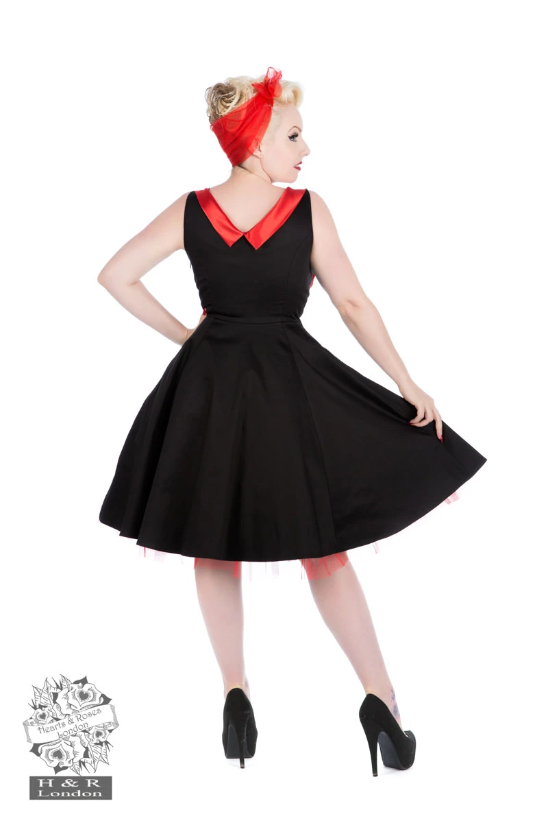 Add some sizzle to your step in H&R London’s Hot on Top Dress! Made out a beautifully soft stretchy cotton, the Hot on Top Dress is a stunning swing dress for evening with a hot red satin bodice on the bust line. Satin wraps the shoulders and bust beautifully in it soft smooth fabric, while enchanting and enhancing your decollate! Dress flares out at the waistline and has a full swing skirt, perfect for dancing in. Dress has a built-in cotton lined red petticoat for even more pinup pleasing! Dress zips up the side for a comfortable fit, and hits just at the knee.