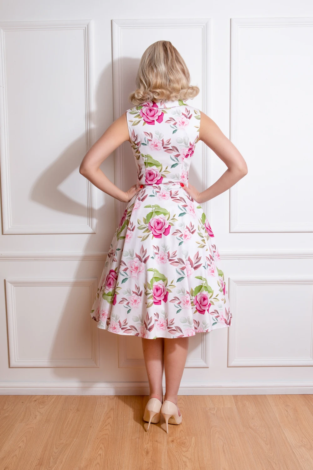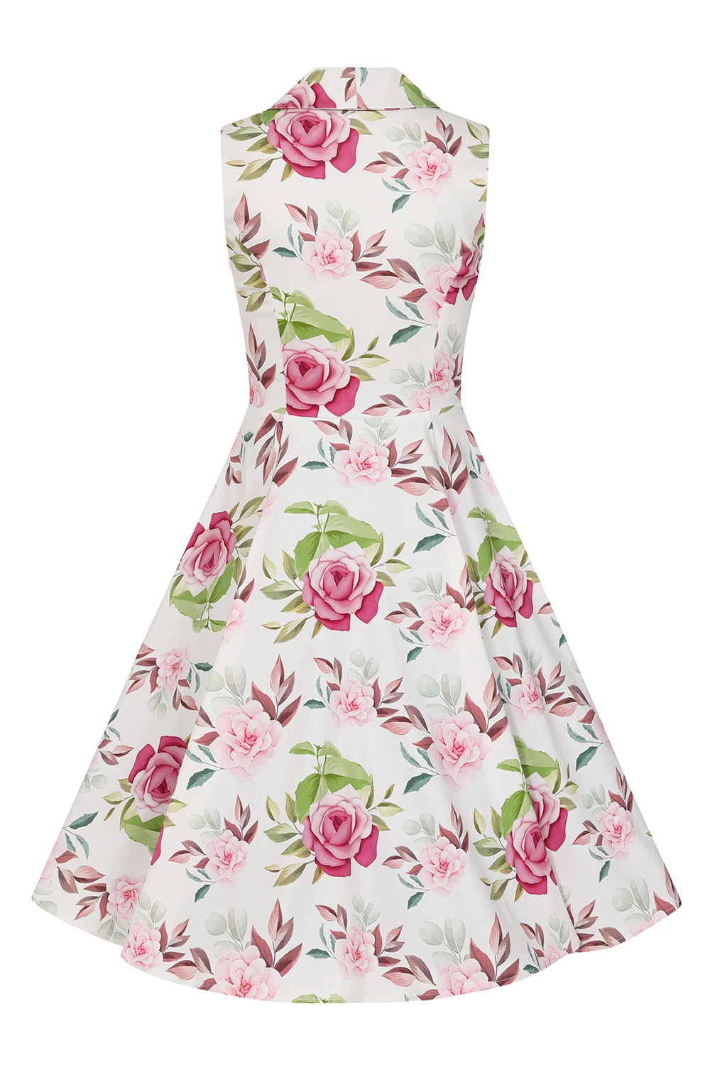 Start the new season with a bang, in our beautiful new Darla Floral Swing Dress. Designed with a gorgeous sophisticated floral print made up of soft pink florals on a bed of charming green leaves. The white base gives the dress an overall fresh summer vibe, perfect for keeping you cool on those hot summer days. The dress has been designed with a beautiful collared neckline which leads down to a row of front decorative buttons. The sleeveless style makes it cooling and the swing skirt adds that extra comfort and style. We haven’t forgotten to add the incredibly handy hidden side pockets to hold your necessities. This style can stand alone without any accessories or can be styled your own way with your favourite pieces of jewellery. Just add your favourite flats or heels to complete the look!