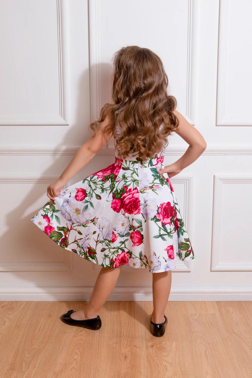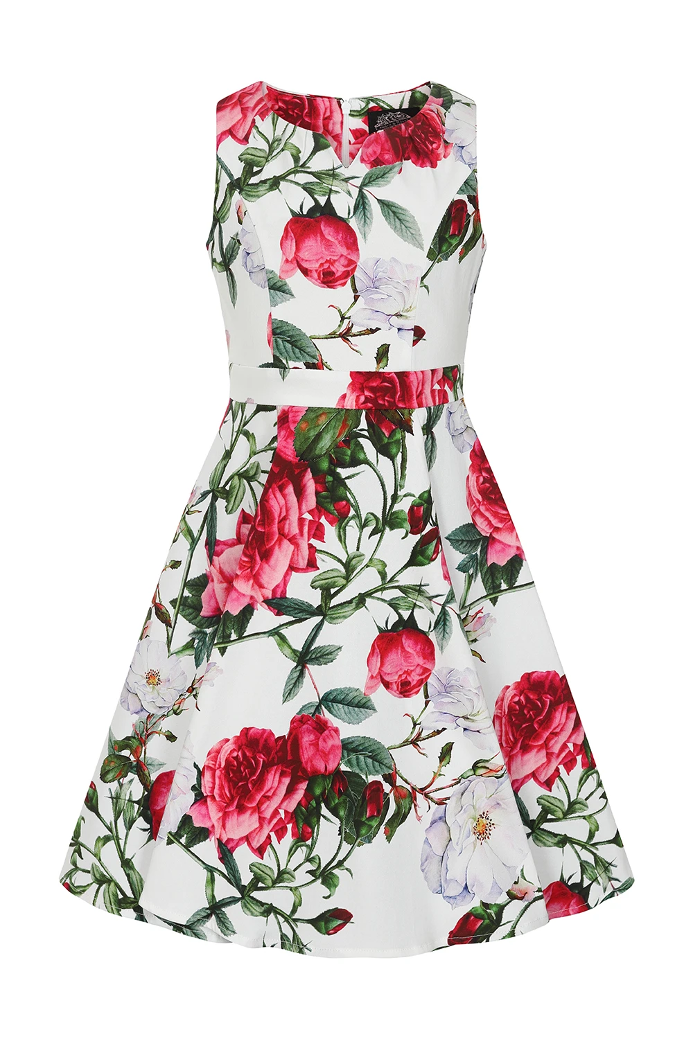 Designed with summer fun in mind, our new Debbie Floral Swing Dress is perfect for a day exploring the city or a picnic in the park. This versatile piece exudes style with its strong floral motif lying on the crisp white base, perfect for any summer occasion. The classic V neckline is incredibly elegant and sits neatly on the neckline. The waistband sits ontop of the full flowing skirt, making this a 1950’s dream silhouette. Pair this style with flat shoes or sandals to complete the look.