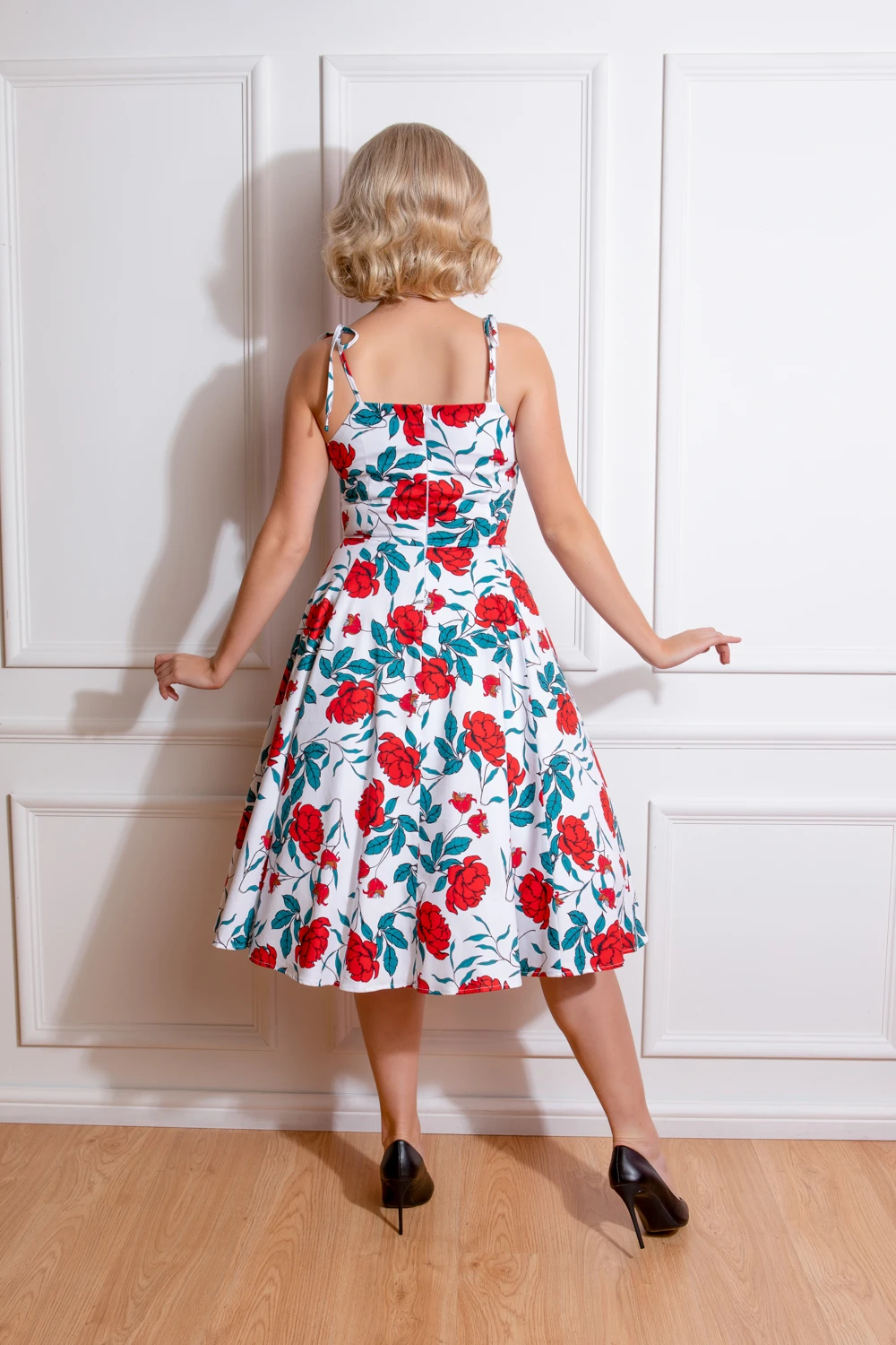 Introducing our brand new Della Floral Swing Dress, with a stand out floral print of bright roses and dark petals on a fresh white base. With a gorgeous sweetheart neckline framed by tie shoulder straps, this style is a summer stand out piece. The fitted bodice which leads into a swinging skirt is reminiscent of the 1950s which we hold dear in our hearts. We of course added our favourite hidden side pockets to add that extra ease to your day. Made using a comfortable and stretchy cotton, this style is perfect for going about those hot summer days looking and feeling your best. This style can easily be dressed up or down depending on your next occasion. Pair with your favourite shoes and you’re ready to go!