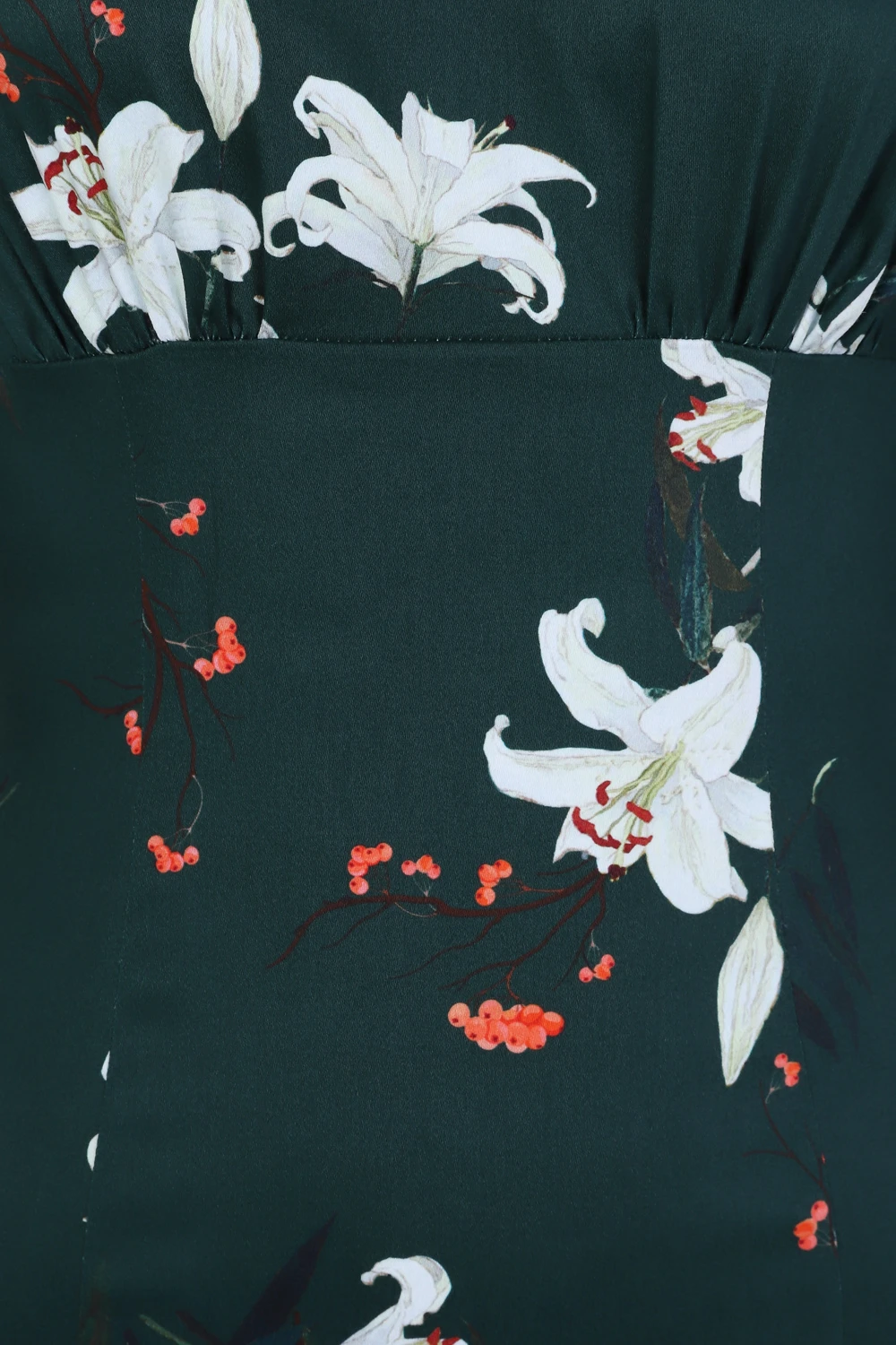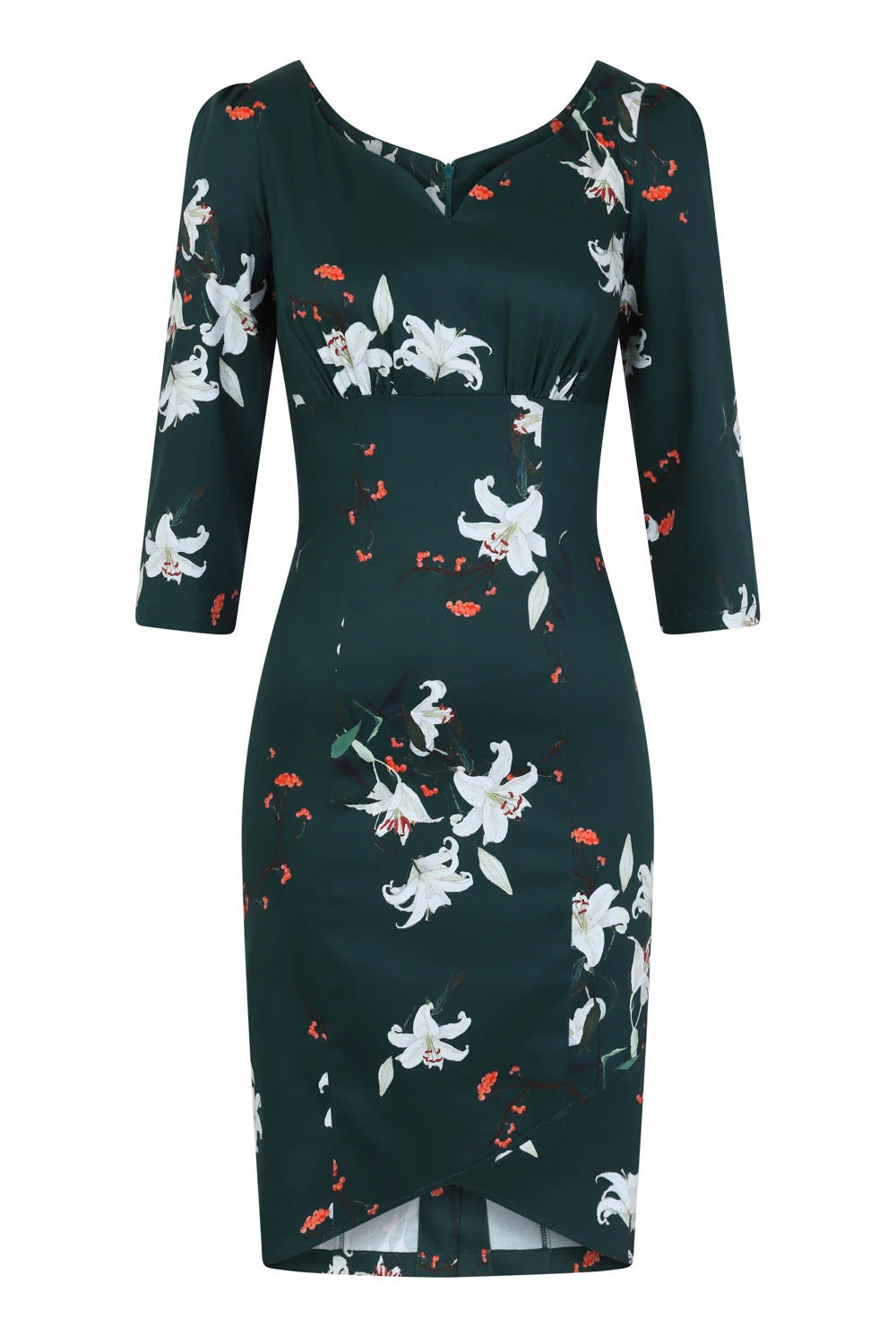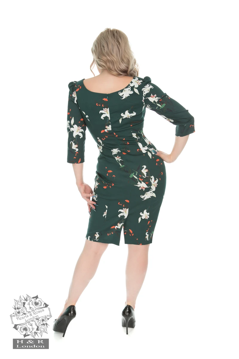 Our classic wiggle dresses are to die for you, so we had to add another to our collection. Our wiggle dresses are designed to give you ladies a聽curvalicious聽silhouette,聽while flaunting a unique elegant vintage styled piece of wear. Our new Dorothy wiggle dress is fabricated on a lovely dark green fabric, with a simple white lily floral print, with orange stems.聽 Surely a mid-century look, with the perfect sweetheart neckline. We also added a unique cut to the detail at the bottom of the dress. The fitted top features 戮 sleeves, with a small ruched detail situated just by the bust. It will be an alluring winter, especially if you have a special occasion to flaunt our new style聽too. You can look fashionable or sophisticated; whatever the occasion is this season.
