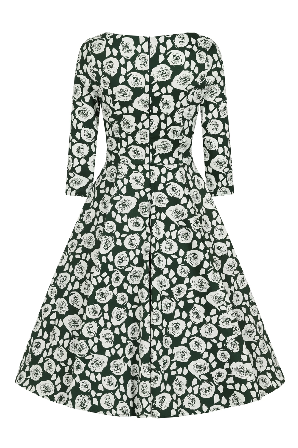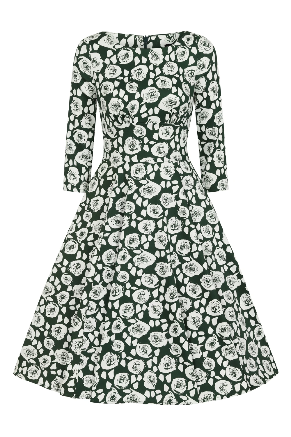 Emelda is an autumnal beauty, with her emerald green shade topped with cream florals, she is a true unique vintage-inspired piece. The classic boat neckline sits beautifully with the gathered empire line, giving this piece a standout feminine look. The hidden pockets are great for keeping your treasures safe while you wear this piece out and about. Pair this style with flats or heels of your choice for your day or evening look.