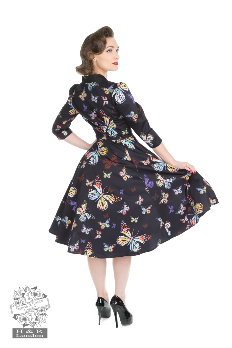 When in doubt, go with Butterfly! 聽 A beautiful swing dress, new from Hearts & Roses London. It is made out of a stretchy cotton blend fabric. 聽Whimsical cute and colourful butterflies on a dark chocolate background creates the perfect autumn/winter dress. 聽It has a V shaped neckline with black trim, 戮 sleeve and side pockets, thus making this dress a flattering fit.
