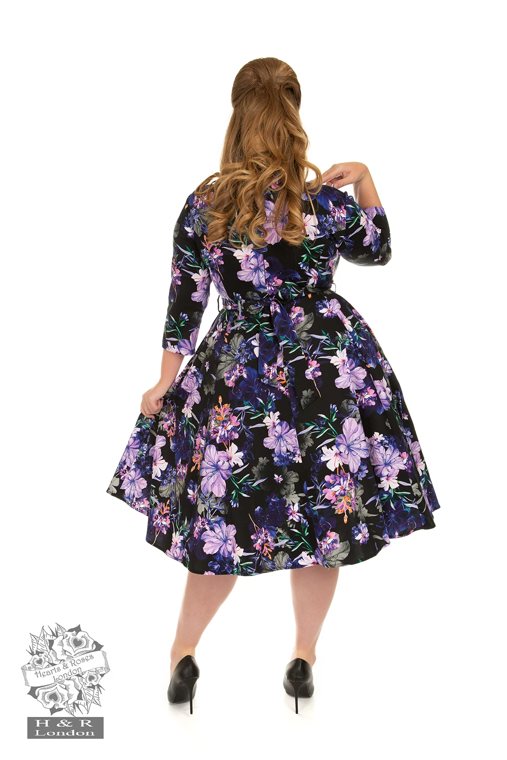 Our new Faye Floral Swing Dress is a purple beauty. The striking colour palette of this style is sure to catch the eye with its purple tones and flashes of orange on a dark black base. A wonderful way to bring colour into your winter wardrobe, the Faye Swing Dress sits easily in any vintage lover’s collection. The elegant sweetheart neckline is very flattering and the tie belt cinches in the waist with a beautiful bow. The decorative front buttons lead from the neckline down to the full swing skirt, which also has our classic hidden pockets! Perfect for a dinner out with friends, just pop on your shoes and you’re all set!