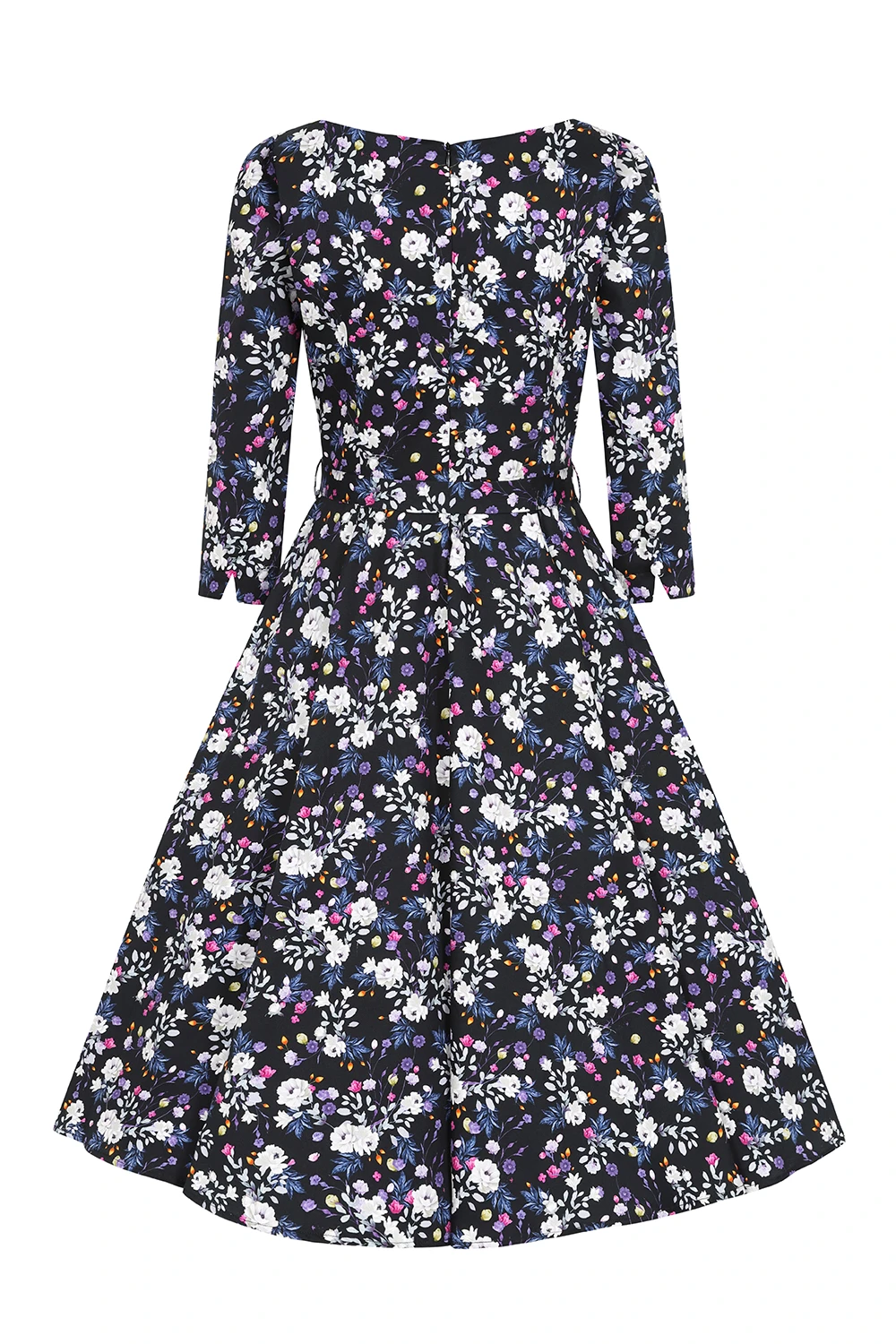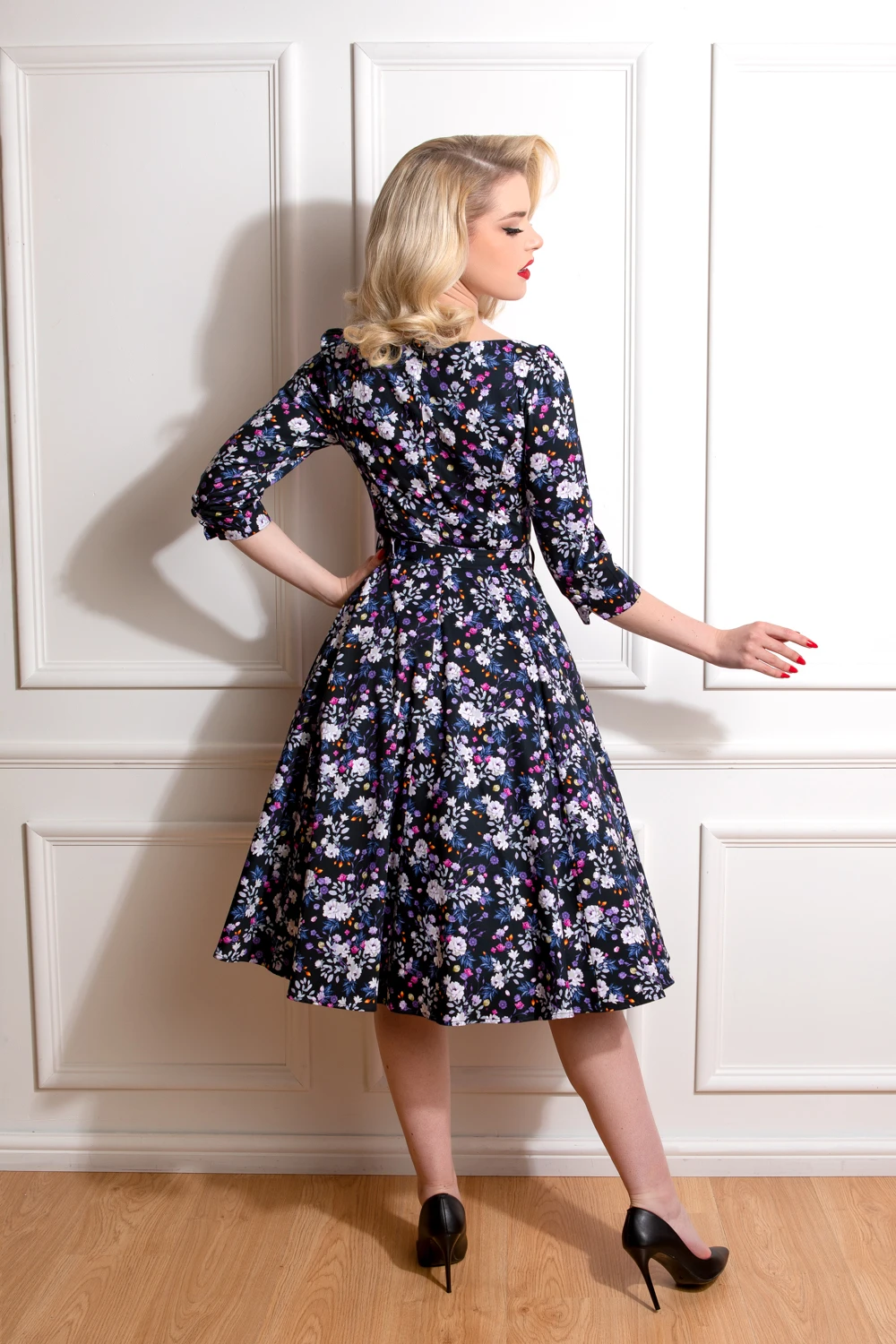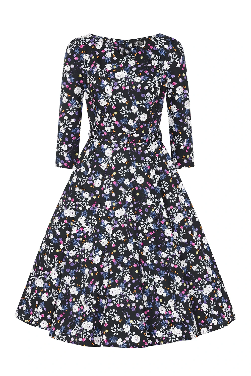 Introducing our new Georgia Floral Swing Dress, covered in a delicate print of bountiful colours. The sweet shades of yellows, purples pinks, blues, oranges and whites sit on a black base to make this the perfect winter floral. The simple boat neckline with front notch balances well with the detailed print. While the fitted bodice and belted waist then flows out into a full swing skirt which moves in a romantic way. With added concealed side seam pockets, this swing dress is not only stand out but practical too. Ready to wear to your next event, this style is perfect for day or night. Just pair with your favourite flats or heels and you’re all set!