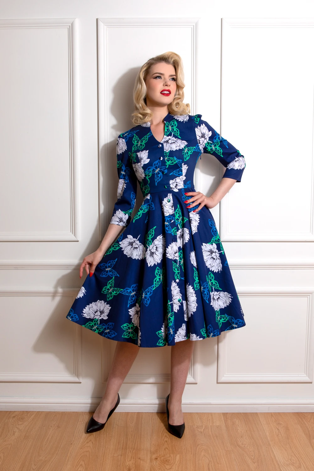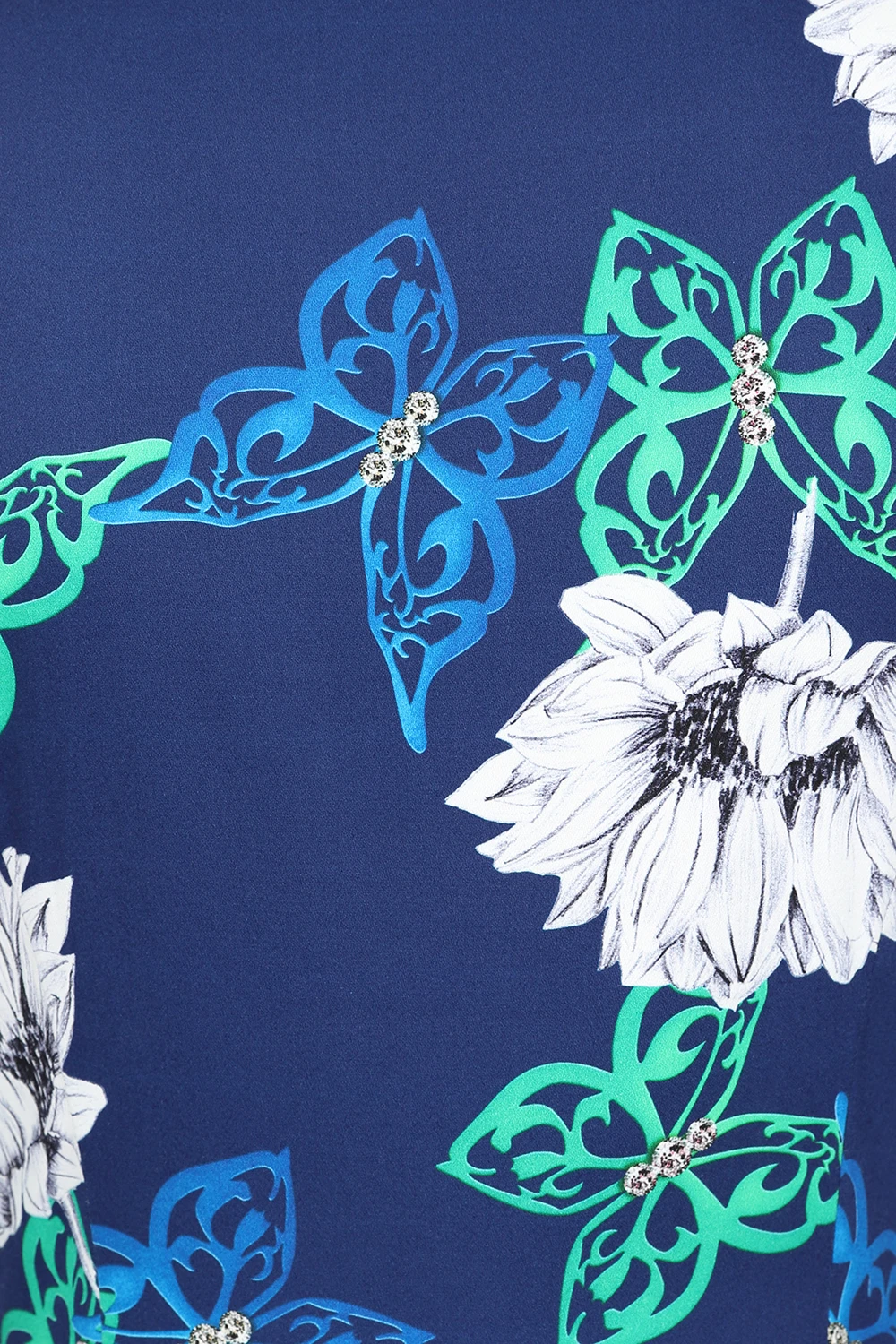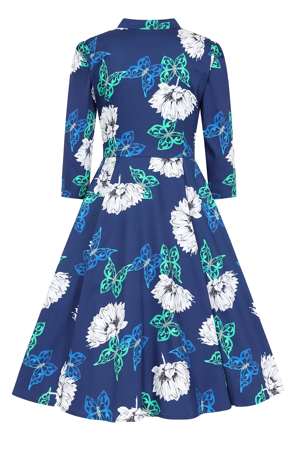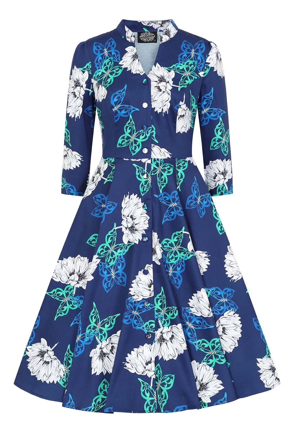 Made to be seen, our brand new Gloria Floral Swing Dress is bursting with bright greens, blues, whites and navys. The beautiful, bold and bright butterflies stand out on this swing style which is perfect for a picnic in the park or an evening dinner. The sweet diamond studded butterflies make this a playful piece for the winter months, bringing light into the darker evenings. The v neckline with stand collar gives a classic structured feel alongside the gathered ¾ length sleeves. The front decorative buttons add an extra design detail which cascades down the front of the style. We added our favourite hidden side pockets for added ease. Just pair this dress with your favourite flats or heels and you’re all set!