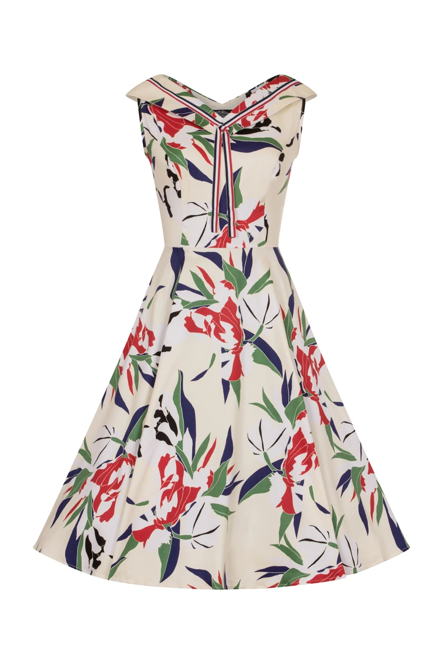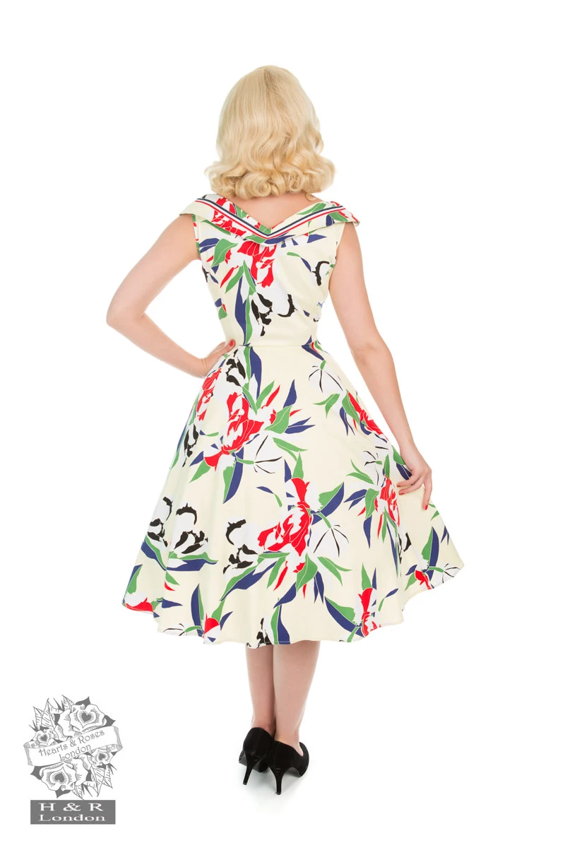 Hearts & Roses brand new sailor dress captures the beauty of the Seven Seas in a floral print embellished onto a pastel yellow background. The v-neck graces us once again in a fold over collar with a red and white lace trim, ready to be bowed up. The blend of leaves in blue and green portray the natural colours of the ocean and help to bring the dress to life.