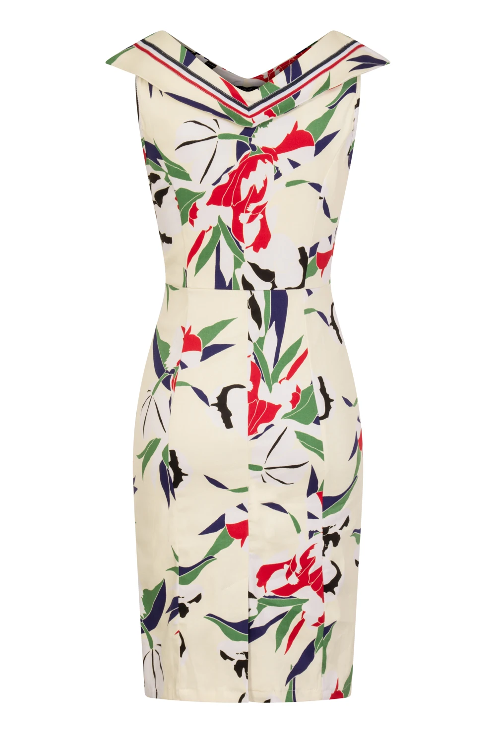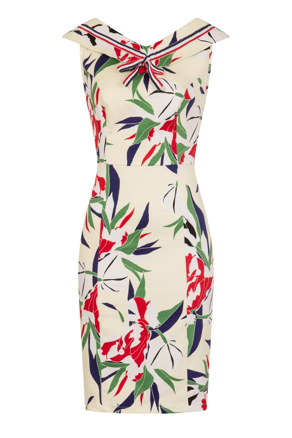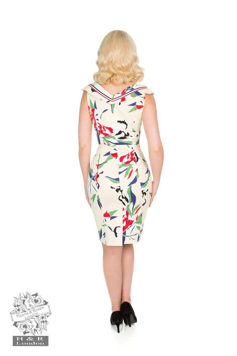 Hearts & Roses brand new sailor dress captures the beauty of the Seven Seas in a floral print embellished onto a pastel yellow background. The v-neck graces us once again in a fold over collar with a red and white lace trim, ready to be bowed up. The blend of leaves in blue and green portray the natural colours of the ocean and help to bring the dress to life.