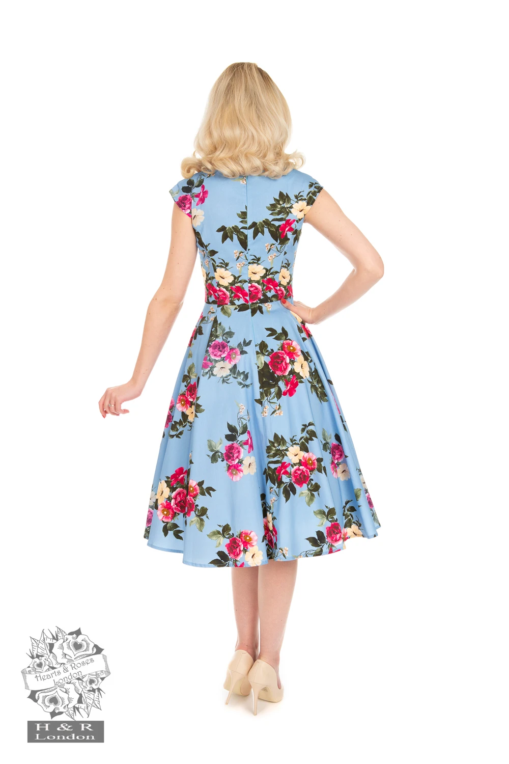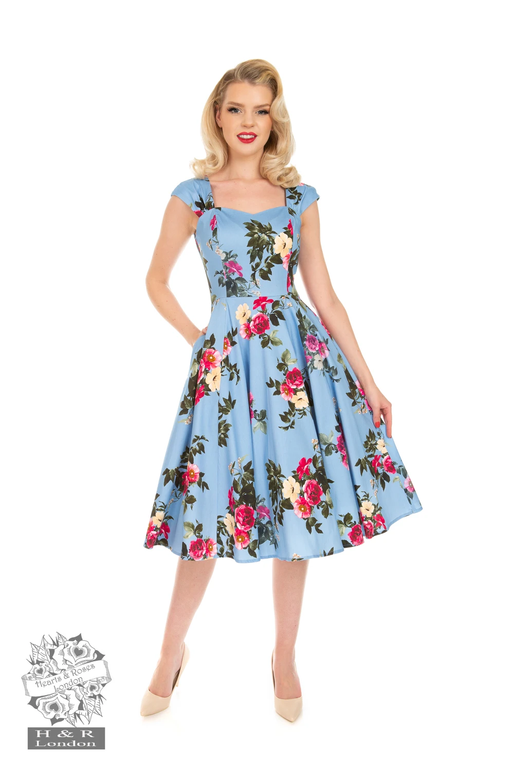 Jolene is here and she is ready for the next adventure! Her beautiful blue floral print sits perfectly under the array of pink, cream & green floral clusters giving this style a retro feminine feel. The gathered yoke seams sit neatly with the cap sleeve to give this piece elegant coverage, while the fitted bodice against the full swing skirt work together to create that traditional 1950s silhouette we love and adore. The concealed back zip makes this piece easy to put on after you have perfected your 50s hair style, without compromising on the overall look of this swing. Pair with flats or heels to complete the outfit!