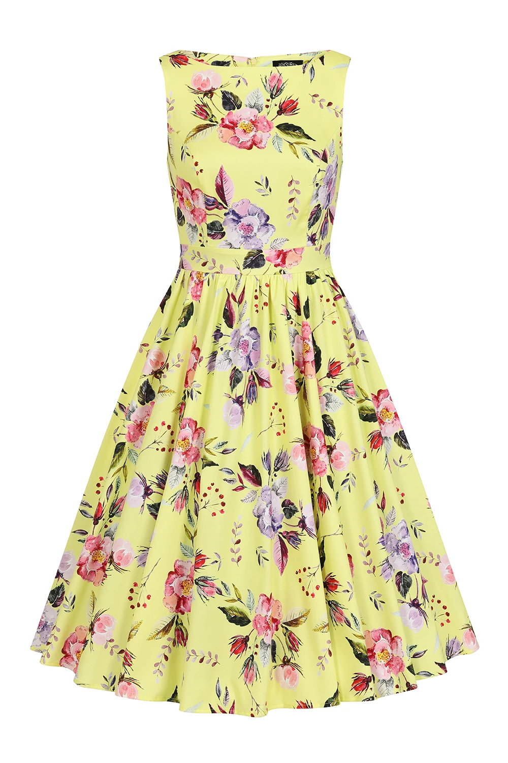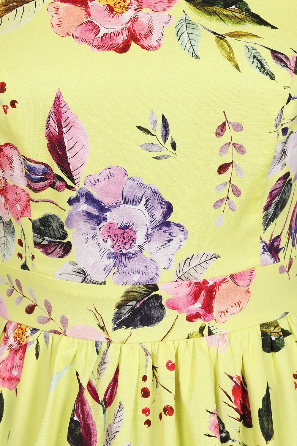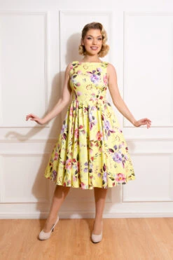 Stand out from the crowd this season with our brand new Josie Floral Swing Dress. Its bright yellow floral design is made for those hot summer days. Reminding us of that bright summer sun, this gorgeous yellow base colour features beautiful pops of purples, pinks, greens & reds, all combining beautifully to make an eye catching floral design. While the boat neckline and fitted waistband balance beautifully with the gathered full swing skirt. This piece also includes our signature side seam pockets for your ease.