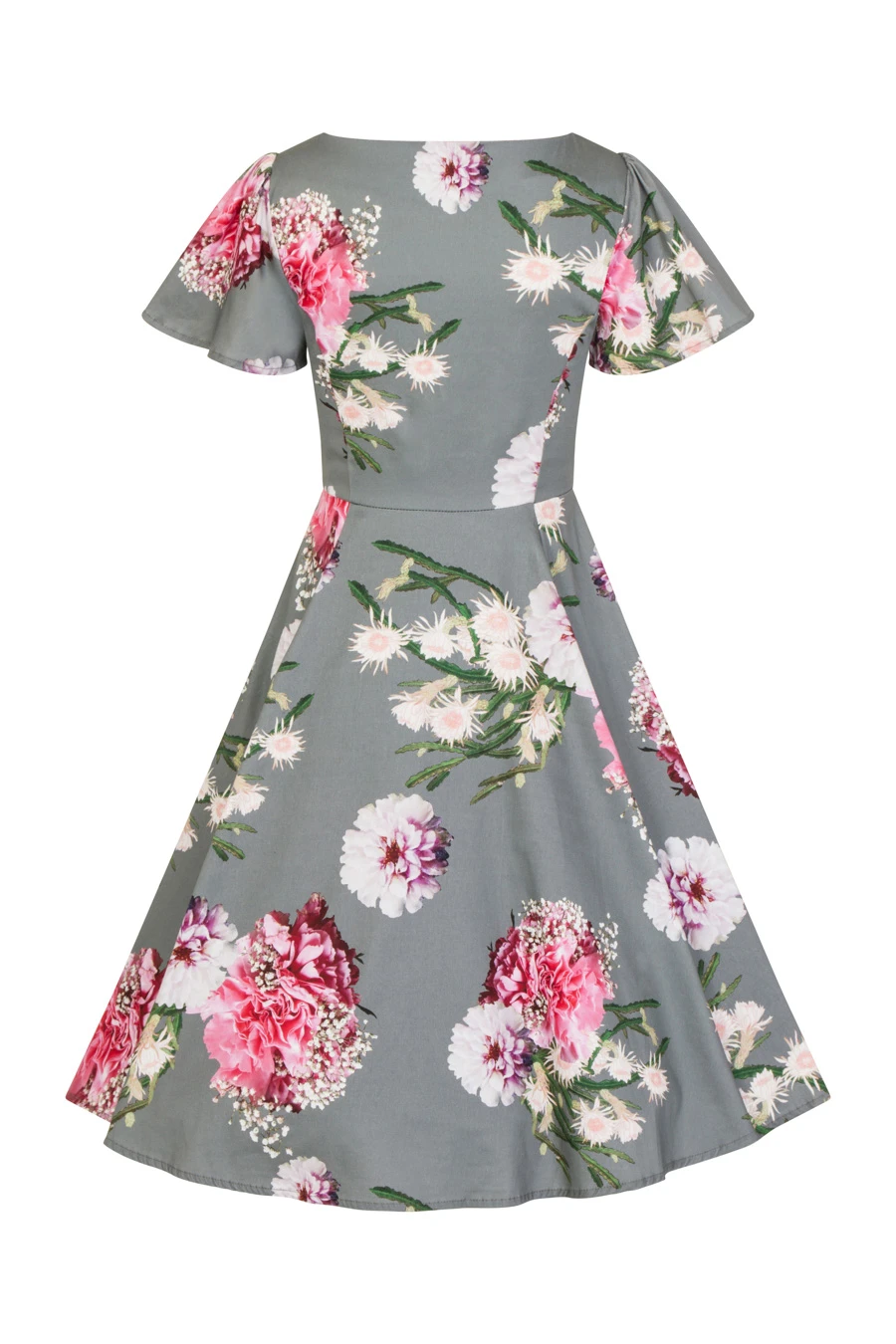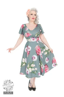 A new design with a popular print! We present another top seller, in a new classic and stylish design. The Lamour swing dress has an eye-popping digital print of floral in white, pink and light pink. The contrast of the colours adds a vibrant looking design to this piece for any vintage lover. The dress is fabricated on a cotton blended grey fabric, with a simple v neckline, while the fitted bodice flows into a gorgeous full effect swing skirt. It also features loose sleeves, to give you a more comfortable feel around the arms in the summer. Lastly, this addition gives you joy if you choose to add to your collection of vintage beauties. Come on ladies, Lamour says it鈥檚 best, so add this timeless and classic addition to your wardrobe. Also available in a round neckline design (3755)