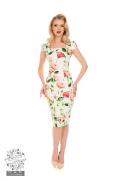 Our new Linda Floral Wiggle Dress will bring you straight back to the highlights of the 1950s era. Its romantic pink and green floral print will have you waltzing the streets. The gathered cap sleeves give extra drama to the piece and the square neckline is flattering teamed with the fitted body of the wiggle dress. We made sure to add a concealed back zip so you have all the ease without any compromise on style. The back vent adds extra comfort to this fitted style. This dress can be worn with or without accessories, and can transition from a day to night outfit.