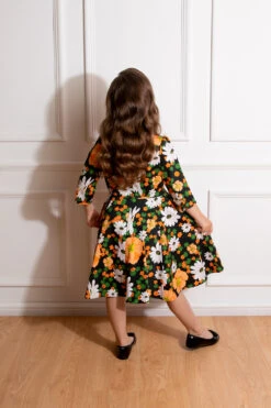 Welcoming our brand new Maria Floral Swing Dress in Kids. Made in our comfortable cotton blend fabric, this style has been designed to wear with ease and comfort. This fabulous floral is made up of bursts of reds, blues, whites and yellows, all laid out on a dark black base to let the colours pop. The shape features a classic boat neckline and waistband. While the simple shape of this piece allows the print to speak for itself. Made with our classic stretchy cotton to allow non-stop playing, this style is perfect for all events. Just add your favourite shoes and you’re all set!