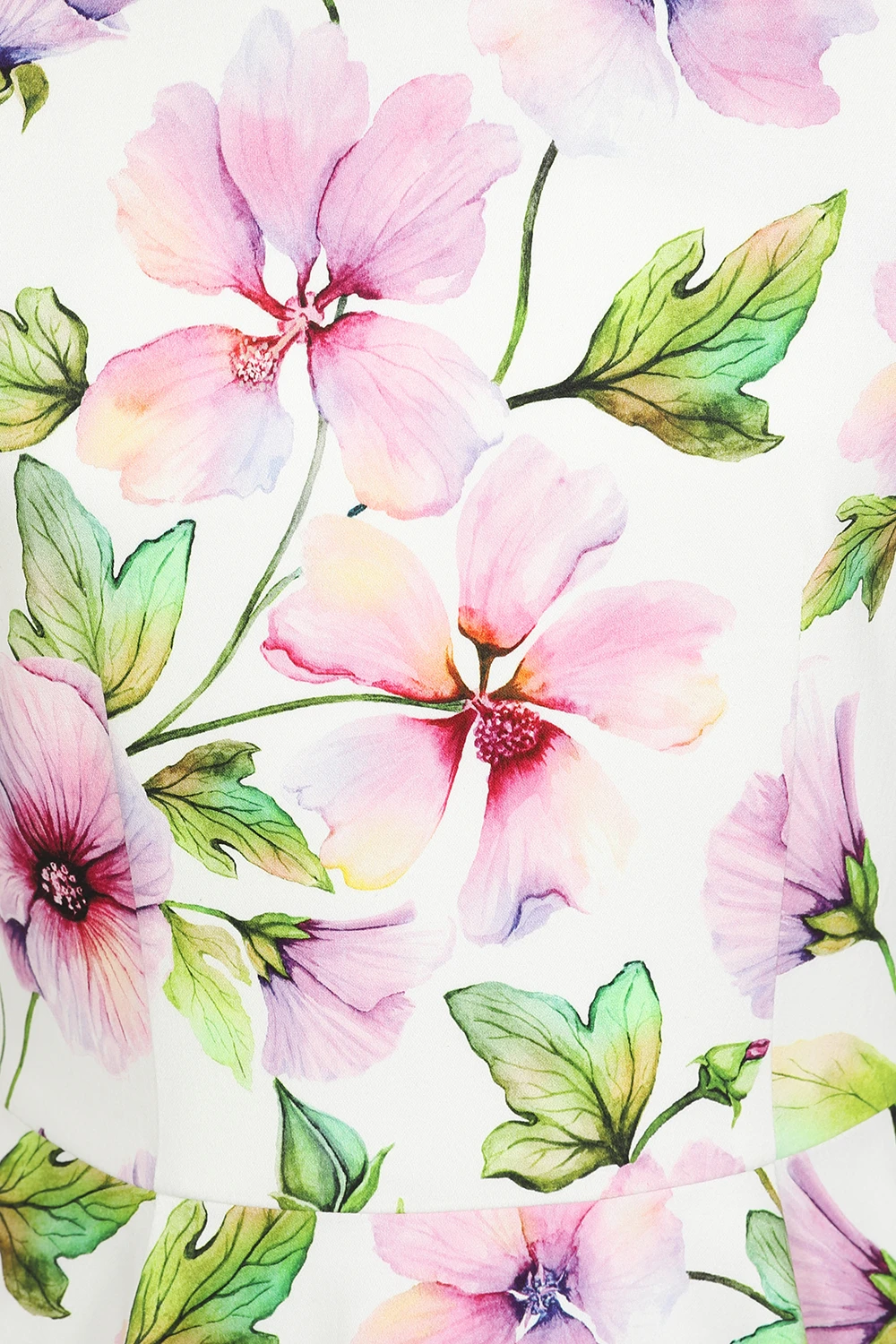 Move with a spring in your step this season, in our Naomi Floral Swing Dress. This print is in full bloom with its purple, yellow and green tones scattered all over the spring white base. The classic 1950s shape of this style with its fitted bodice and full swing skirt, works perfectly in balance with the detail on the neckline. Designed with a boat neckline, this style also features a sweet lapel detail which is topped off with delicate buttons. Perfect for a summers garden party. Just style with your favourite shoes and you’re ready to go!