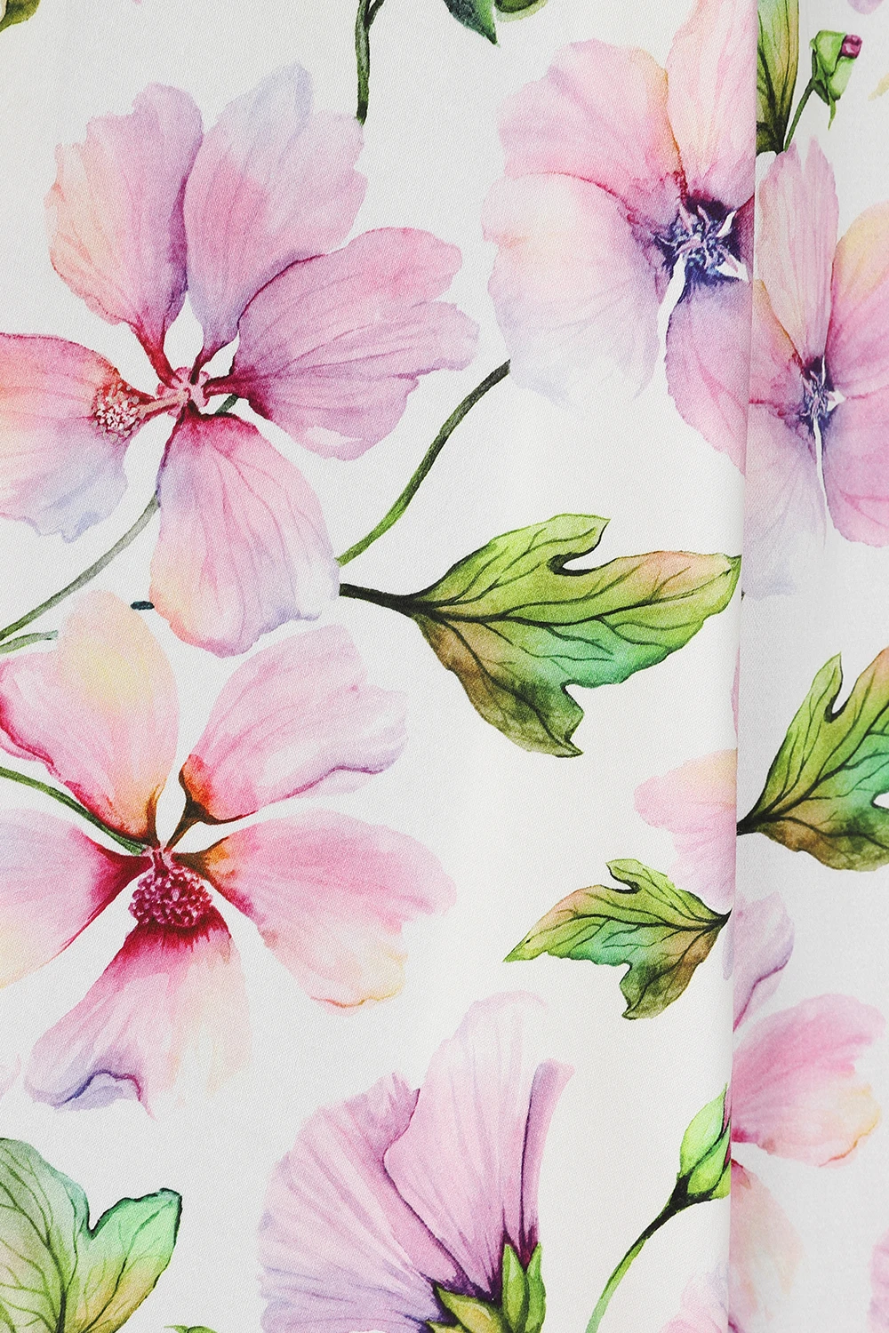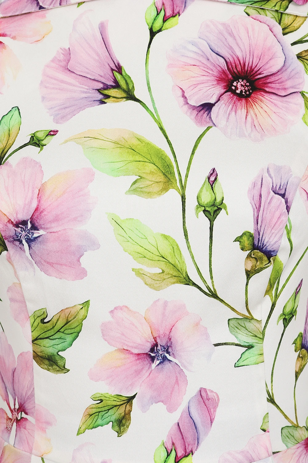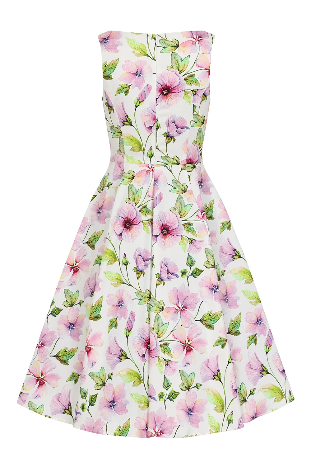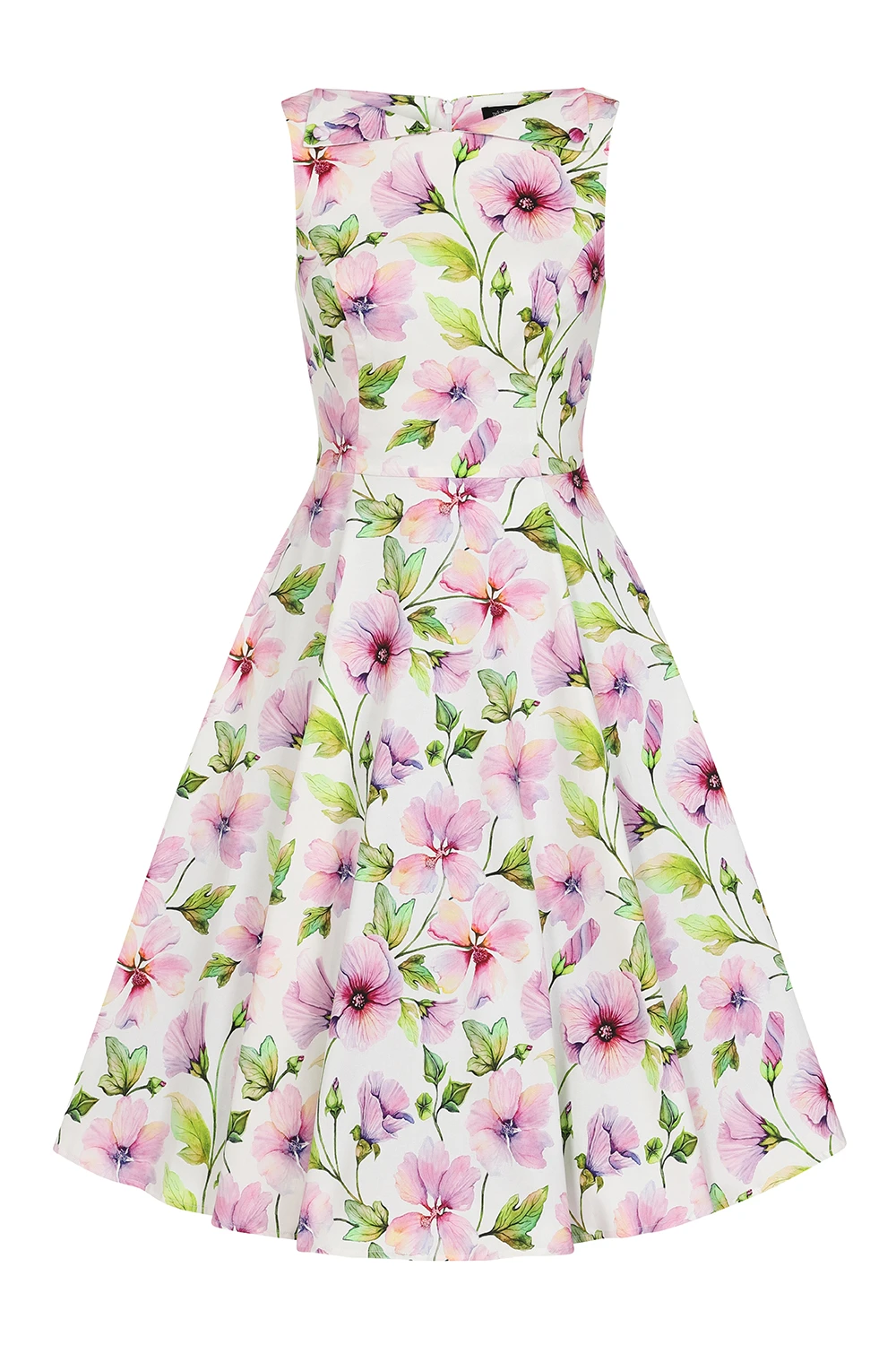 Move with a spring in your step this season, in our Naomi Floral Swing Dress. This print is in full bloom with its purple, yellow and green tones scattered all over the spring white base. The classic 1950s shape of this style with its fitted bodice and full swing skirt, works perfectly in balance with the detail on the neckline. Designed with a boat neckline, this style also features a sweet lapel detail which is topped off with delicate buttons to catch the eye. Perfect for a summer’s garden party or an evening event, this style will take you easily from day to night. Just style with your favourite flats or heels and you’re ready!