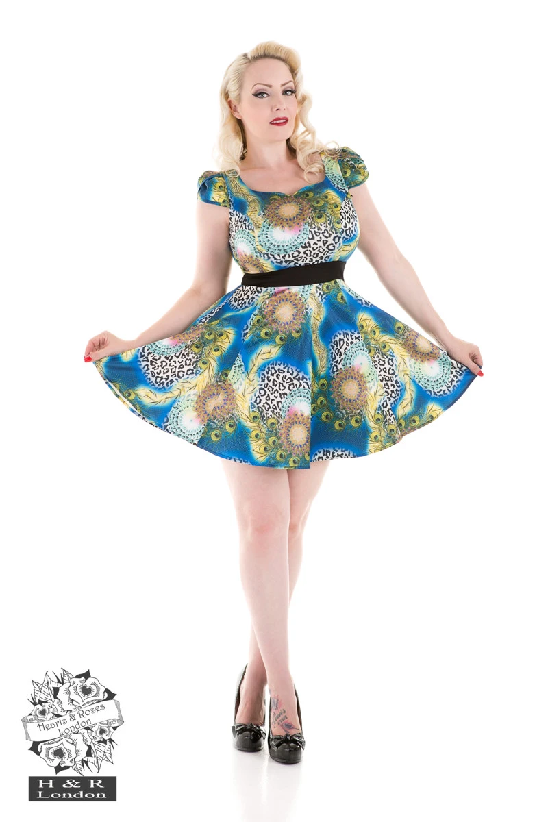 Pretty as a peacock in our mini dress! Â Featuring a fabric with a soft silky sheen and peacock feather/leopard spot design. Â Our dress has capped sleeves, a sweetheart neckline, and black band at waist for added shape.