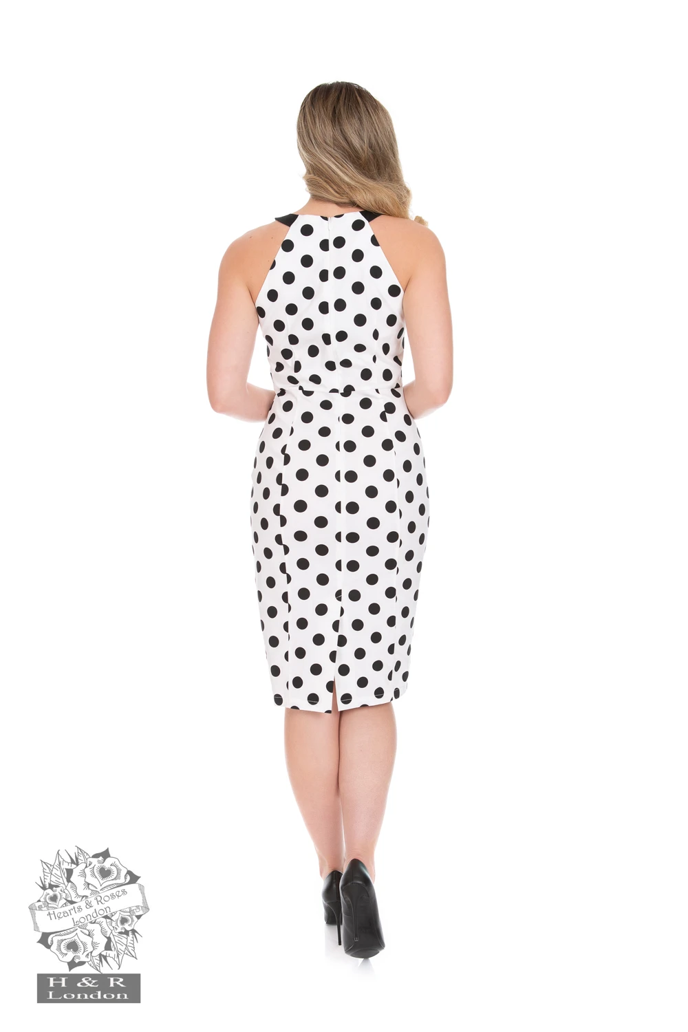Our striking new polka dot wiggle dress is perfect for a vintage lover’s wardrobe. Its bold large black polka dots create such great drama against the white wiggle dress base. The neckline is divine, with its gathering at the front to create a fuller look and contrast black panels at the neck, creating a chic and elegant silhouette. This style is figure hugging in all the right places. Add simple accessories with this piece and you are ready for your night out!