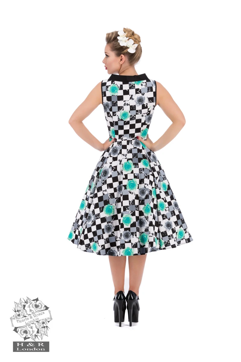 Check out them checks! 聽H&R London’s brand new Petite Tulips Swing Dress will have you racing for the finish line for the pinup relay! 聽 Unique checkerboard printed vintage-style swing dress with adorable petite tulips of mint green and grey spliced within. 聽 聽Dress is sleeveless, with a thick black piped v neckline, and black piping on the sleeve openings. 聽Dress skirt flares at the waist.