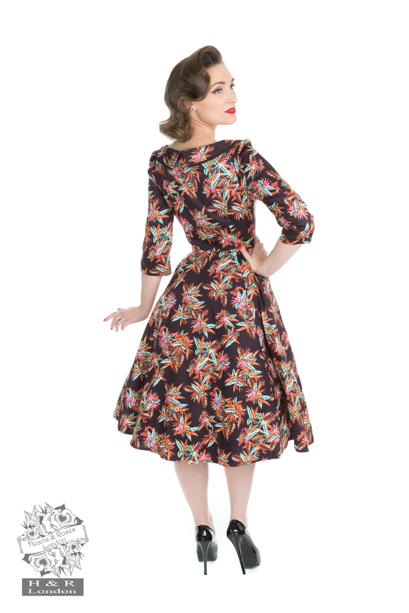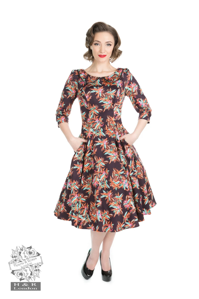 Show off your true colours in H&R London鈥檚 Phenomenal Wild Floral Dress. This is a gorgeous vintage inspired dress for any kind of classy and/or stylish occasions. It features peter-pan collar neckline with black trim all around the collar and 戮 sleeves with side pockets. This amazing vintage style swing dress is made out of a soft and wondrously textured cotton set on a brown background with light brown and light green leaves all-over. Dress has a full swing skirt and hits just below the knee and zips up the side for a comfortable fit.