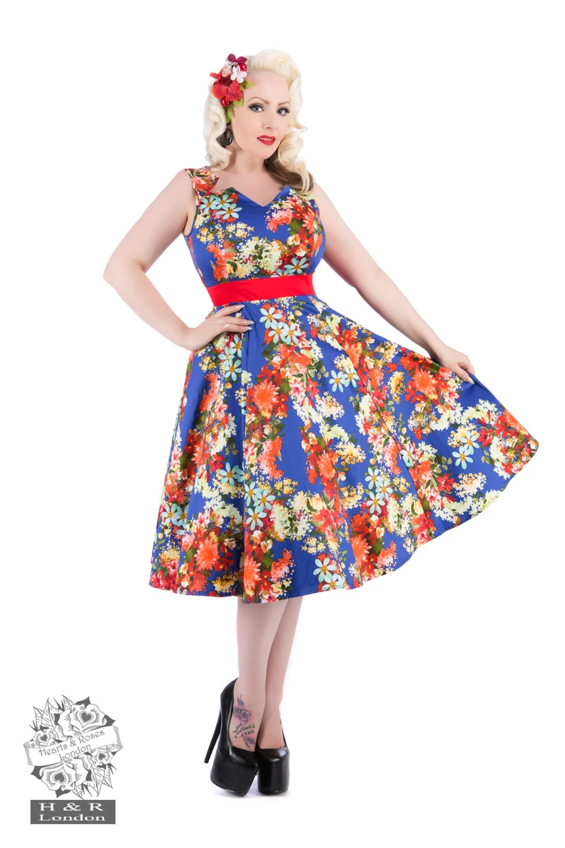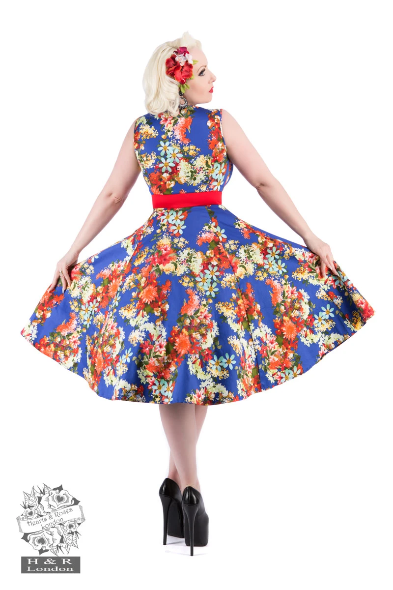 The Royal Blue 50’s Georgina Floral Swing Dress is a rhapsody in blue. 聽A sleeveless dress with a fitted waist, The Georgina Floral Swing dress features beautiful bouquets of wildflowers throughout, with a V neck with symmetrical side notches. Orange and yellow flowers with sky blue daisies create a stunning floral pattern and the vivid red banded waistline creates a beautiful hourglass. Dress zips up the side, hem hits below the knee.聽