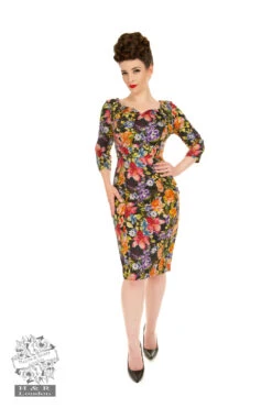 Our Sarah Floral Wiggle Dress is bursting with romantic florals all over this vintage inspired piece. The abundance of colour scattered all over this dress makes this style a show stopper for all occasions! The added waistband cinches in the waist to create that elegant 1950s look, leading down to the fitted wiggle skirt which feels and looks wonderful! The beauty is in the detail, and that rings true with this stunning neckline, featuring a notched front and pretty pleats to accentuate that feminine flare! This piece can be worn day or night, just choose your favourite accessories and you are good to go!