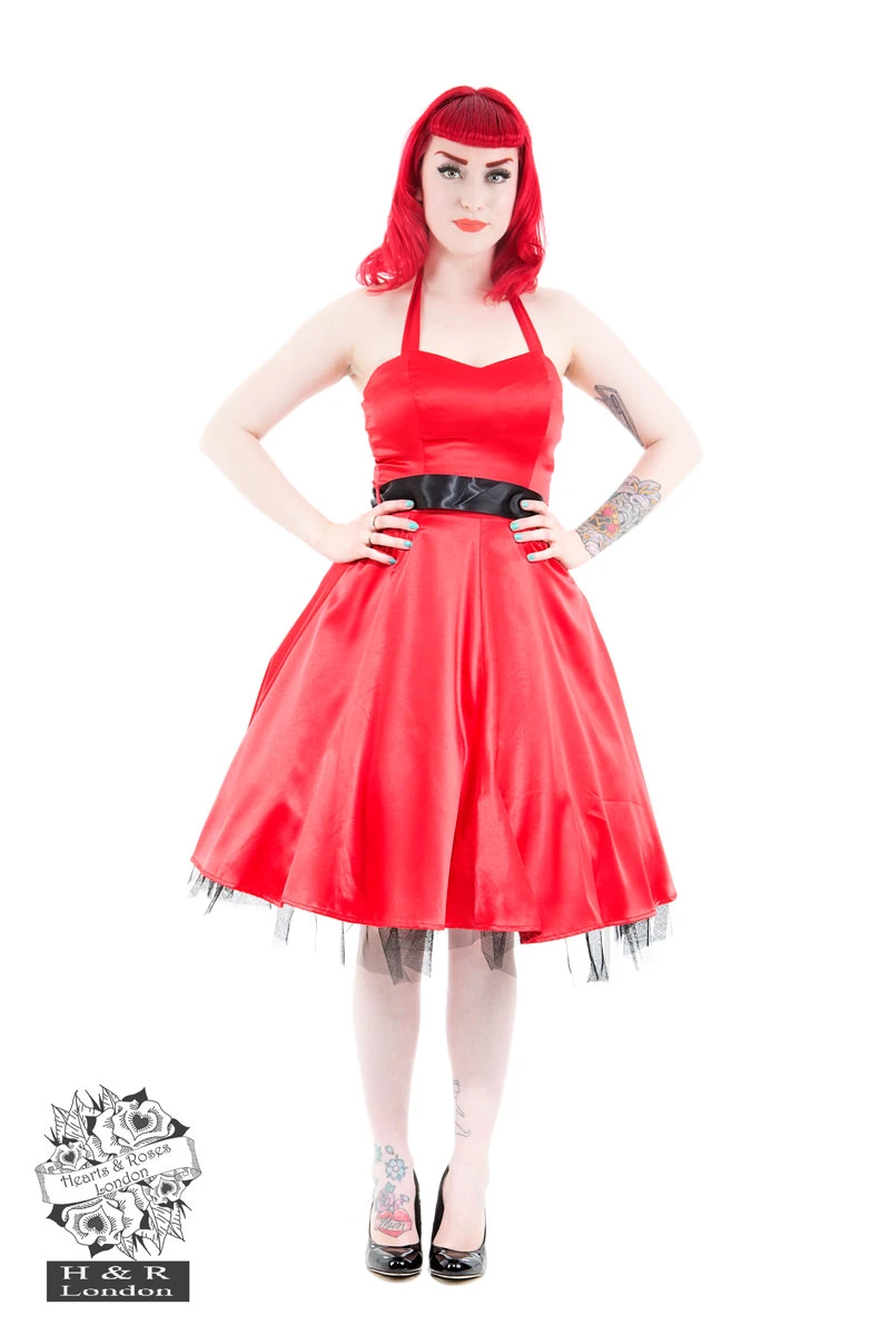 Perfect for that special occasion, this halter-style swing dress is made out of a beautiful silky smooth satin that feels wonderful on your skin. Dress ties comfortably at the nape of the neck, ideal for adjusting to different bust sizes. Halter dress has an empire waist with removable black ribbon belt that ties at the waistline. Dress comes with a built-in underlining for added volume, perfect for creating that hourglass figure!