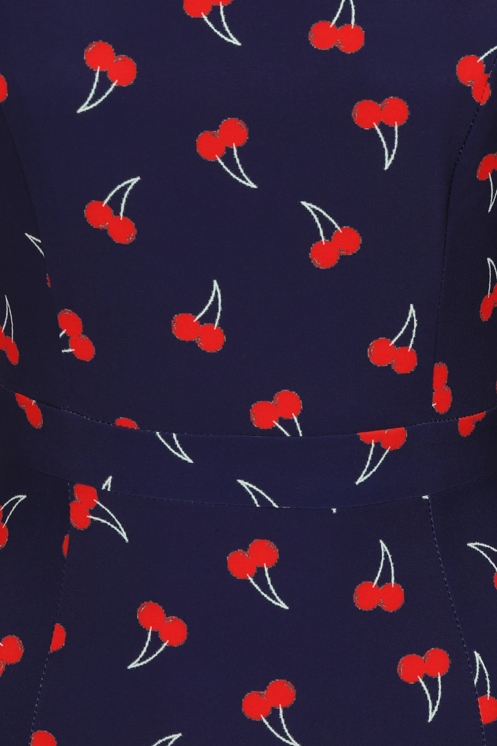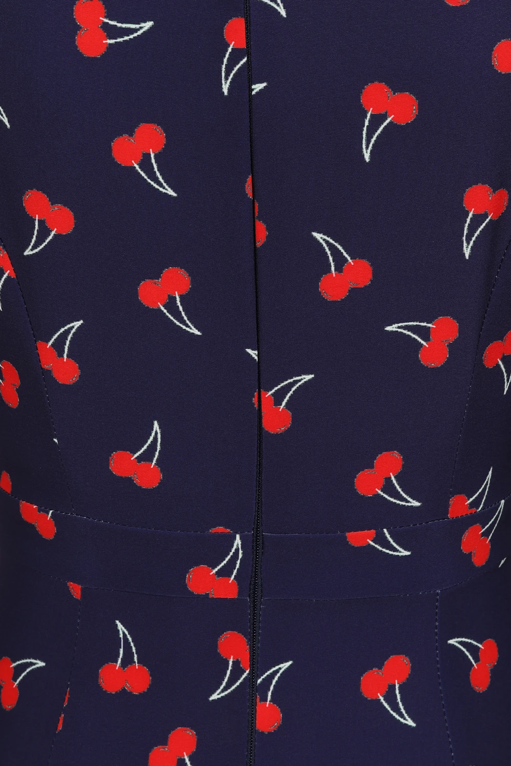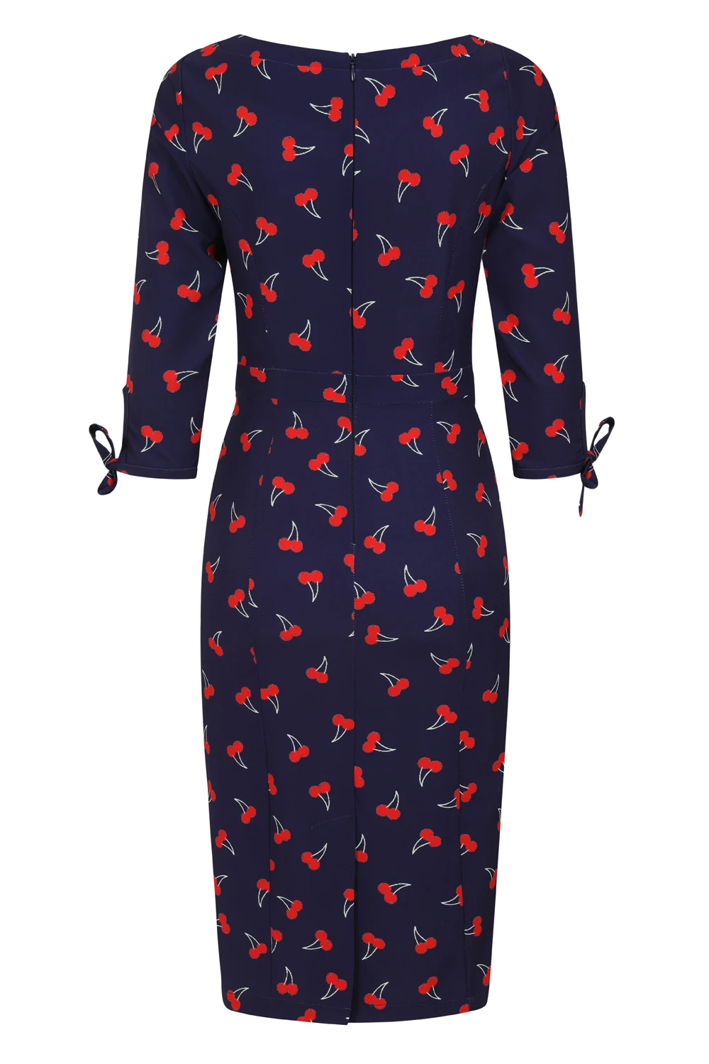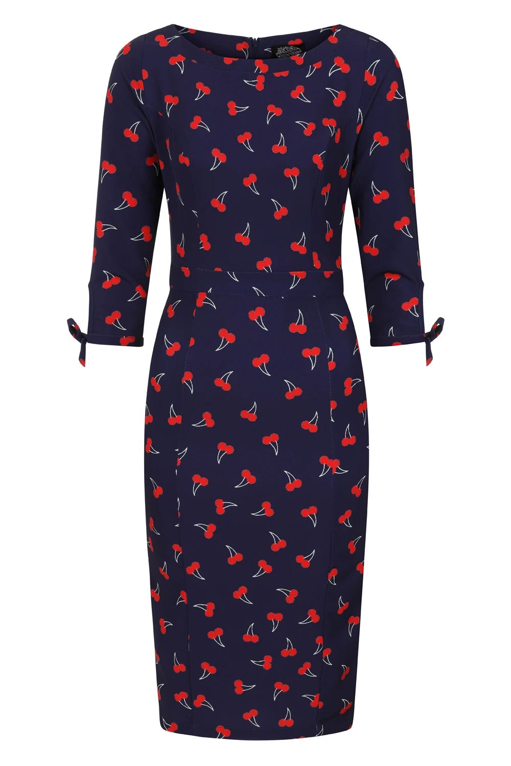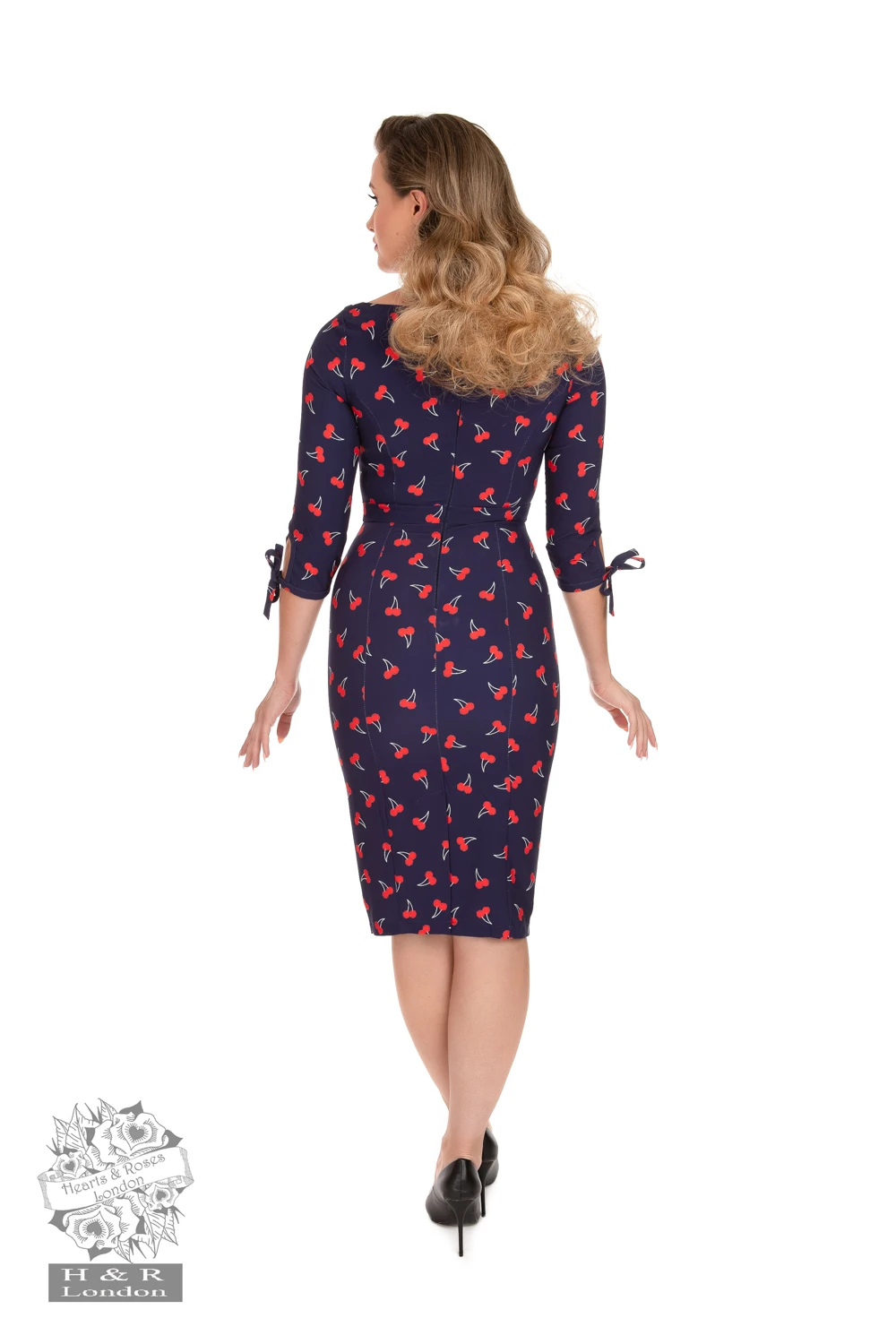 Our newest cherry wiggle is a vintage-inspired must have! Its navy base topped with sweet cherries are the perfect combination for a stand out retro wiggle. Its classic wide boat neckline gives a touch of added class, paired with the tie bow on the sleeve hem which gives the wiggle extra drama. This style is great for day or evening events, just pair with flats or heels and you are ready to go!
