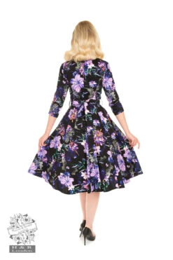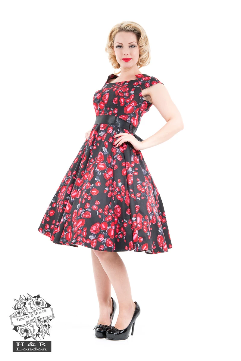 50鈥橲 rockabilly style Taffeta Red Rose Day Dress by H&R is an all year round style which complements a summer wardrobe style or an autumn winter style. The print consists of gorgeous red roses on a black stretchy cotton material. To add a sleek edge, a black satin sash is added which nips in at the waist. The cut of the bodice is fitted which flares into a swing skirt, giving you a sophisticated retro vintage look.