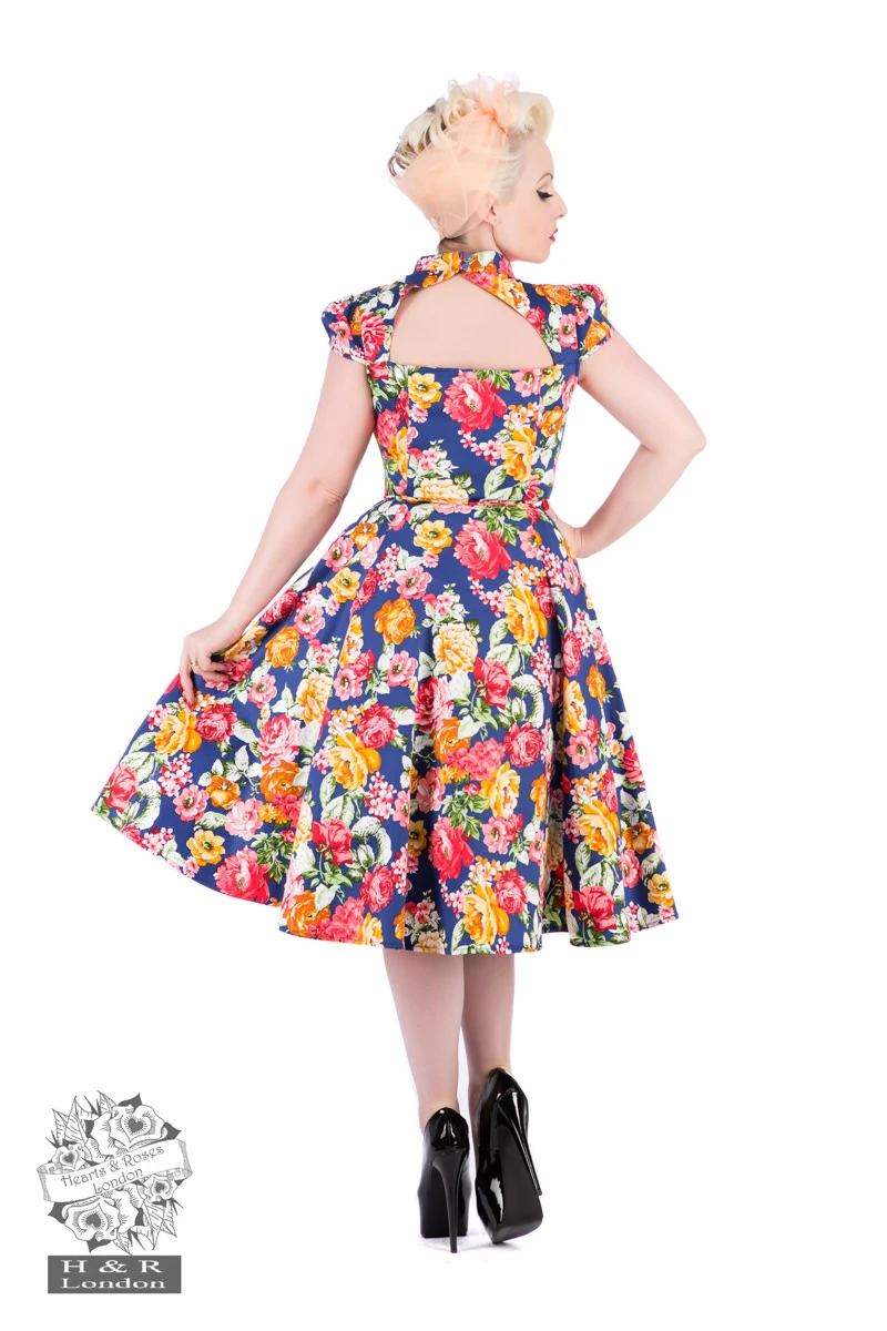 H&R’s beautiful new floral style on our signature luxurious fabric! 聽Our dress has a blue background with a multi-coloured floral pattern. 聽Sweetheart cut-out neckline with banded collar, cap sleeves, and zip at side to close.