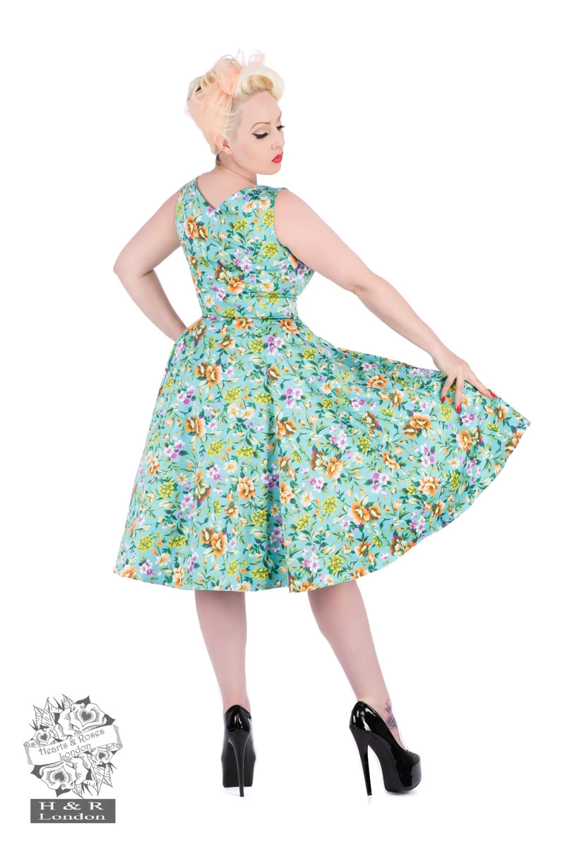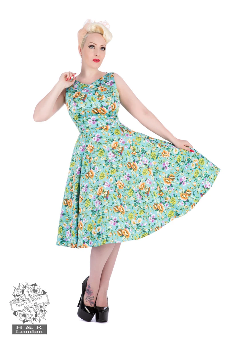Hello, World!  Meet Camilla, H&R London’s bestselling day dress!   Nothing can overstate the Camilla Dress  beauty.  This wondrous turquoise dress is one of the most classic pieces from the collection.  The delicate floral print of orange and lilac blossoms set on a sleeveless day dress is pinup-perfect, while the front fold over collar adds just a dash of whimsy.  Slight v neckline in back shows the nape of the neck.  Dress has a full swing skirt, hits below the knee.  Dress zips up the side for a flattering fit.