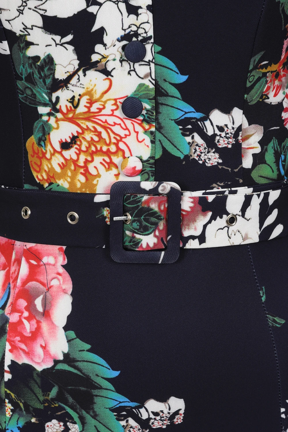 This is the perfect winter floral dress where the stark contrast between navy and white is beautifully expressed to show how the simple colours complement each other so well. The light sprinkle of floral colours brings this dress to life and makes it a graceful piece which embraces a personality of class, sophistication and beauty. The wiggle silhouette works wonders with the retro look. Pair this piece with simple accessories and you are ready for your next event!