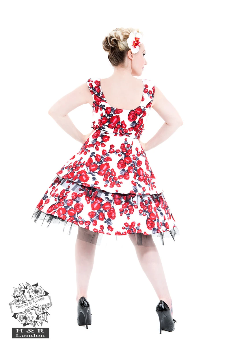 The White Sorrento Red Rose Tea Dress from H&R London is a strappy, tiered dress with corset-tie side lacing. Â Â Beautiful deep red roses and vines form a visually appealing pattern on the fabric, made out of a soft, stretchy cotton. Â Â Side laces tighten and loosen for an ideal fit. Â Â A built-in cotton-lined black petticoat fluffs each layer of this dress for an extra special touch. Â Â Â