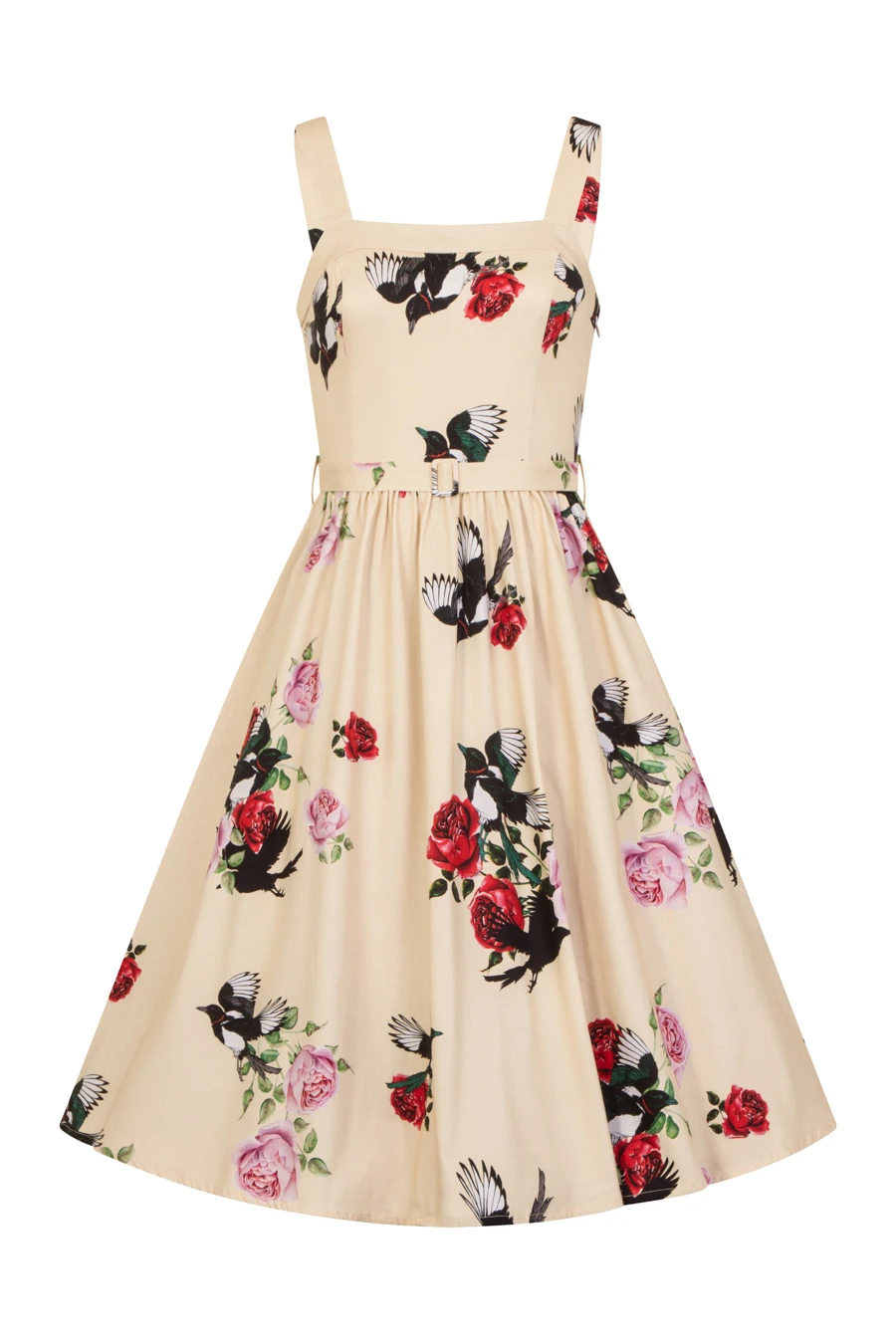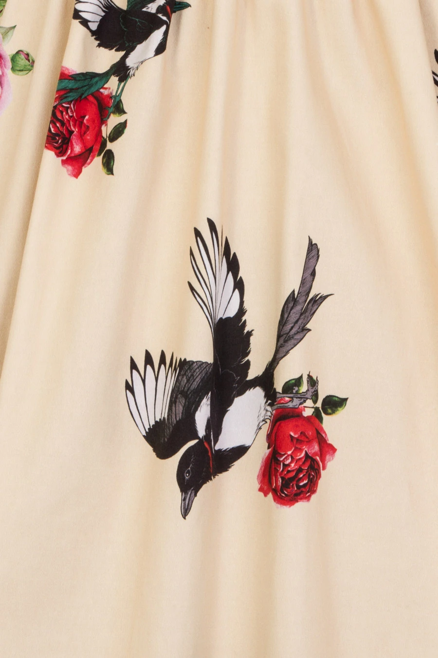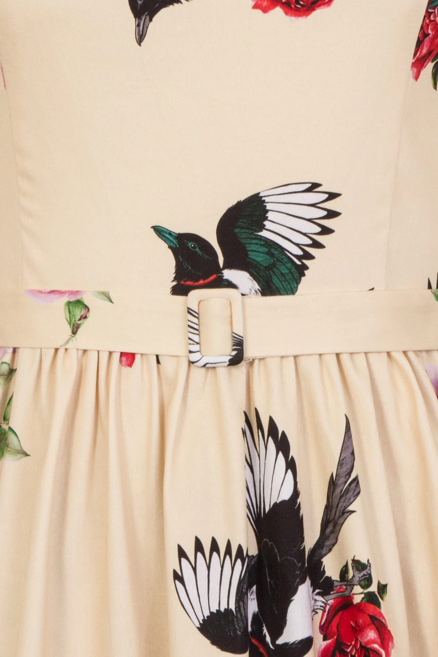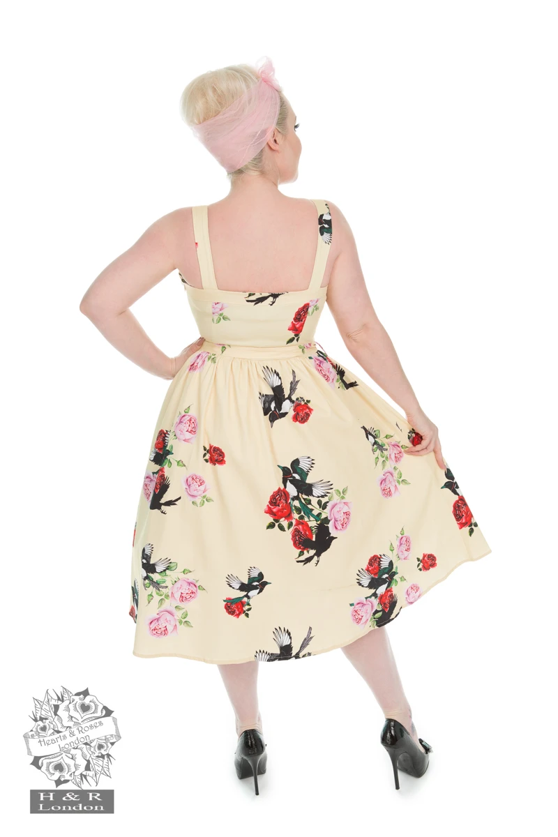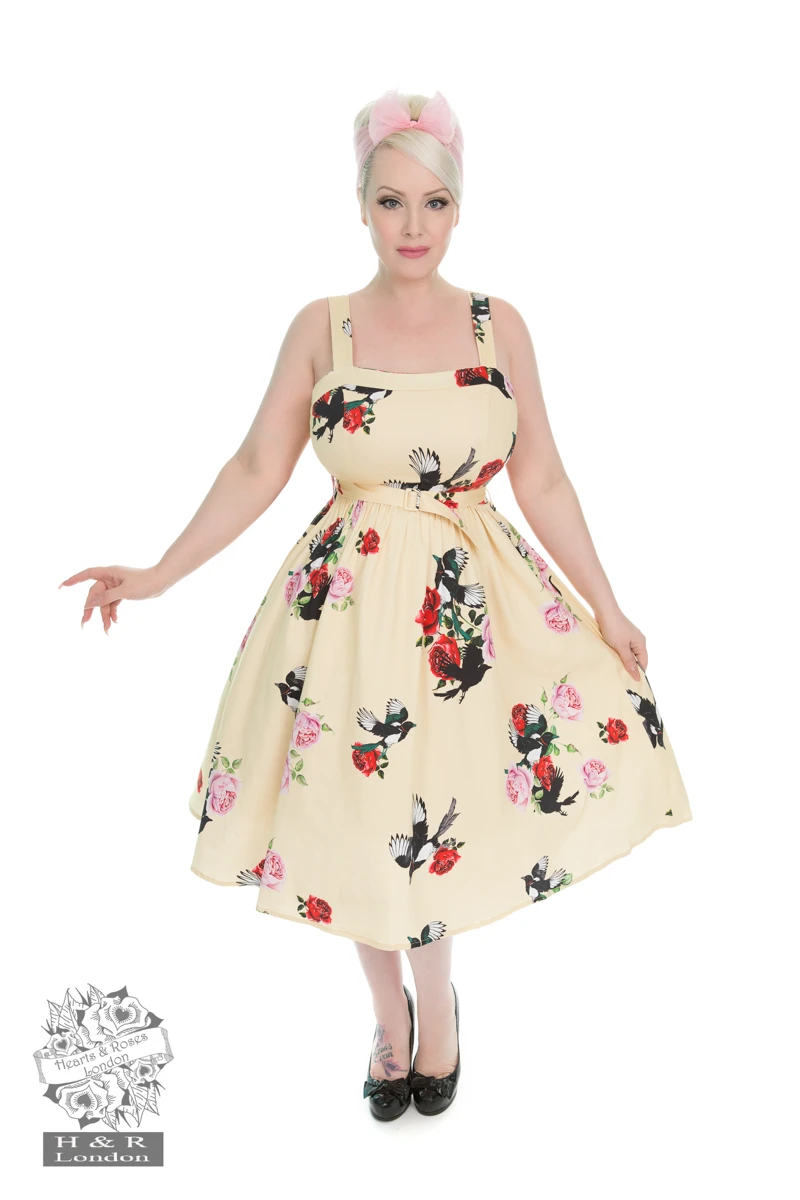 If you love summer and you know it,聽clap your hands. The yellow rose print swing dress is made from a lovely blend of stretchy cotton, in a subtle shade of yellow. Ooh la la 鈥ou will be looking as bright as the sunshine in this beauty. 聽The soft yellow shade will truly have you feeling ready for the summer, while the print and beautiful cut will have you looking fashionable and feminine. The neckline details a simple square neckline with thick straps and a semi-floral print belt which blends perfectly with the print of red & pink roses, with birds surrounding. The bodice fits perfectly, thanks to our choice of fabric. Grab yours before the sun comes out to play.