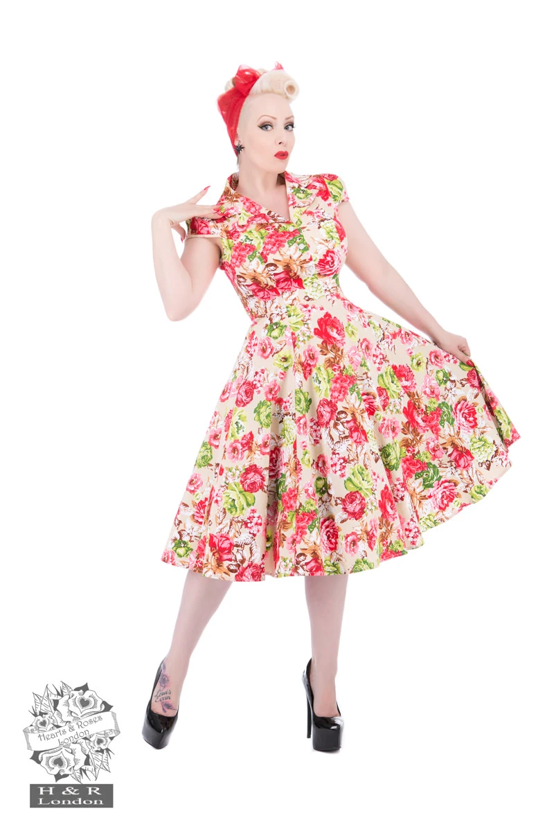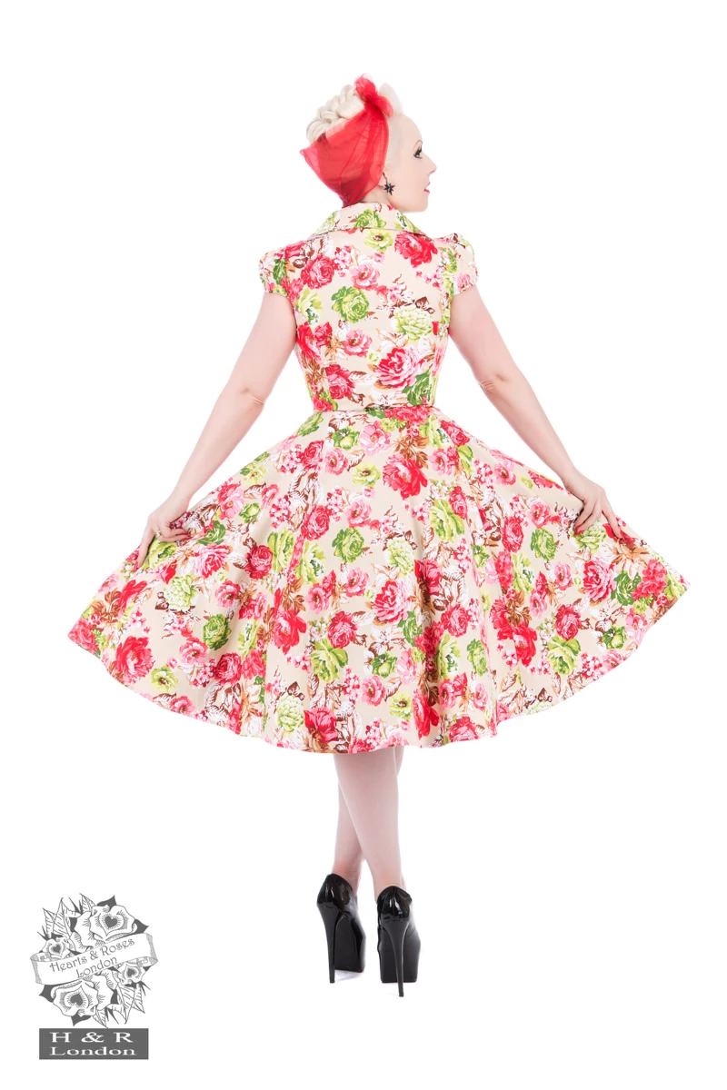 Along with its luscious large floral print, the dress has a full swing skirt set on a khaki colored background.