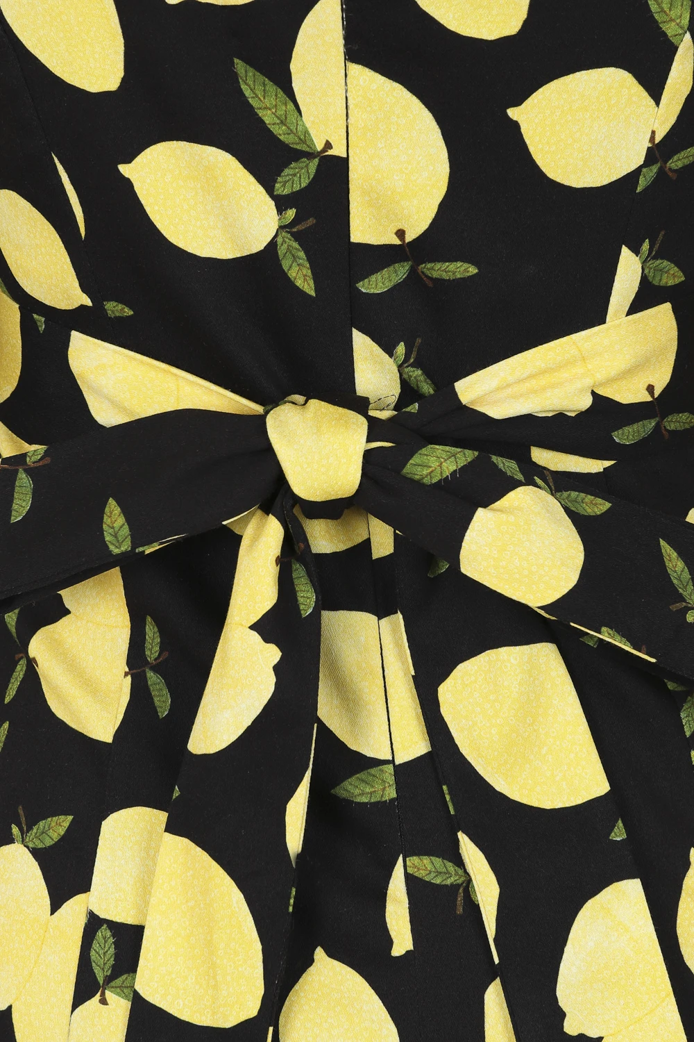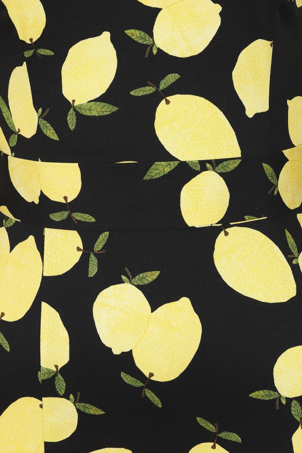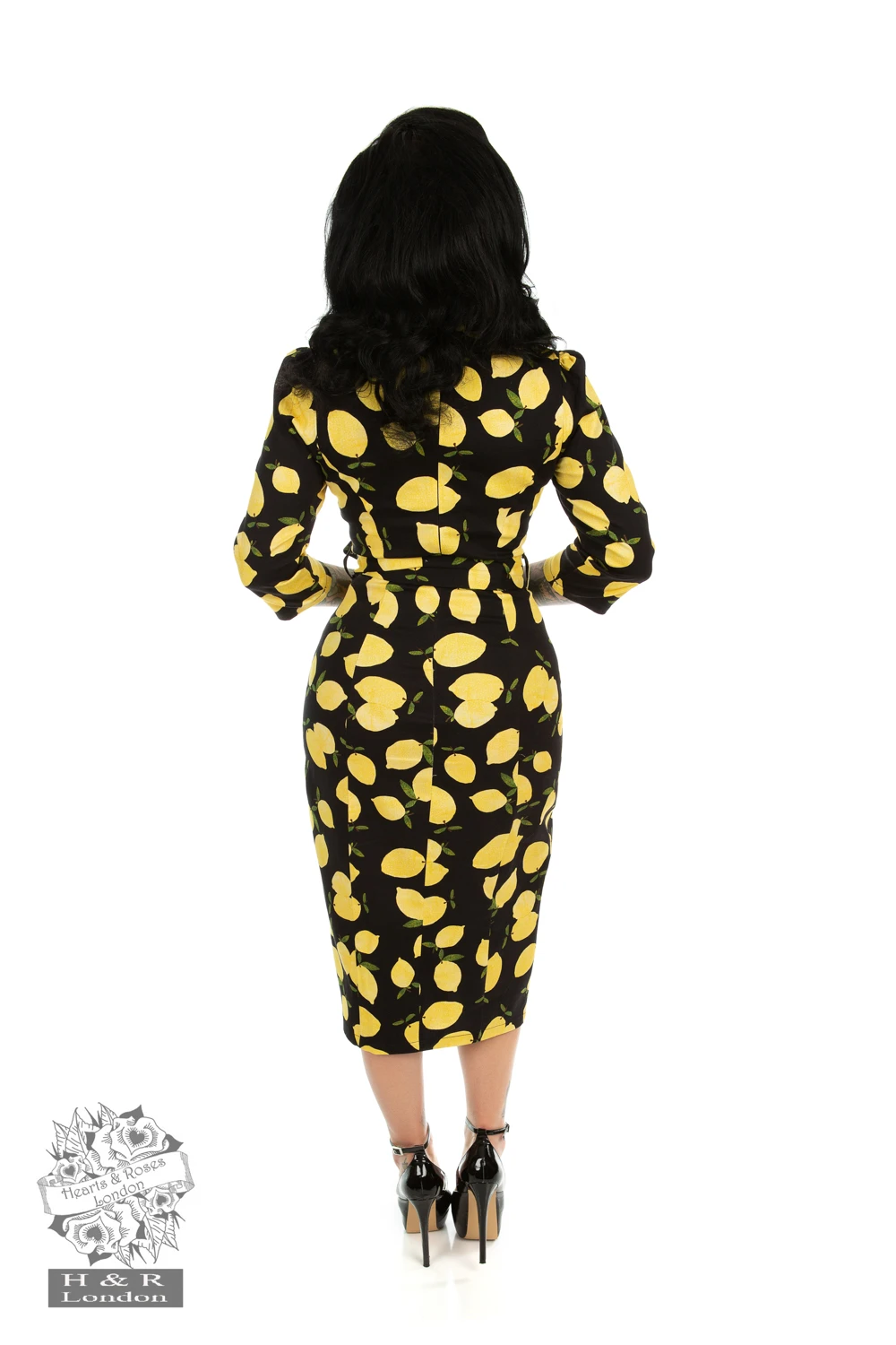 A fresh & zesty piece of wear, with a touch of vintage. Check out our new addition of wiggle dresses flaunting a classic print of yellow lemons, set on a black stretchy cotton fabric, one of our classic blended fabric with spandex for a little elasticity. Our wiggle dresses have become a classic staple for vintage fashion, and our new edit fits perfectly with the others we have to offer. Here we have a ¾ sleeved wiggle pencil dress, with a fitted bodice and a v neckline with a stand collar. To accentuate your waist we also included a tie belt in self-fabric, just to give you a feminine silhouette. Ready to make an impression this season, with our lemon printed dress.